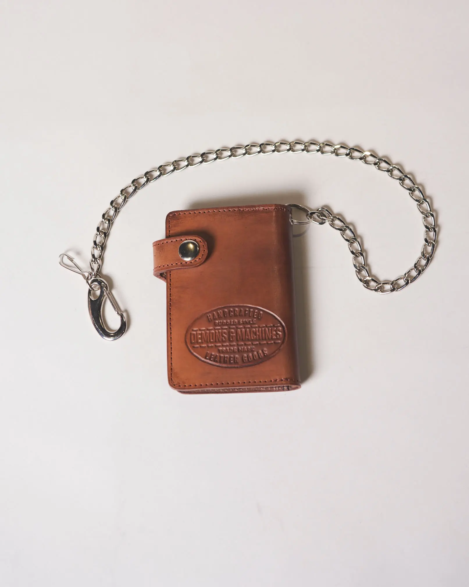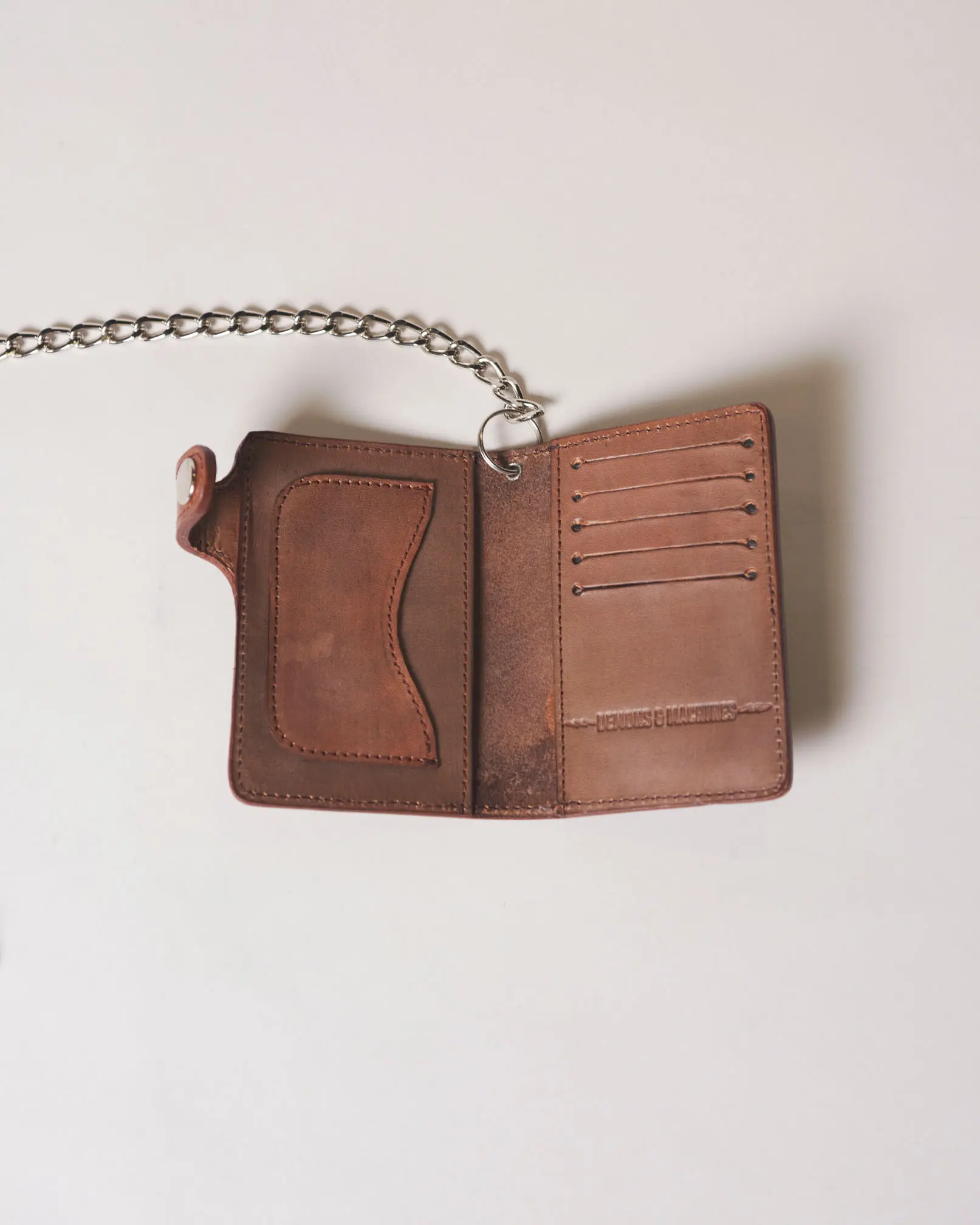Billetera de cuero vacuno con compartimentos para billetes y tarjetas. Cuenta con cadena de aluminio. Cada billetera se realiza a mano.