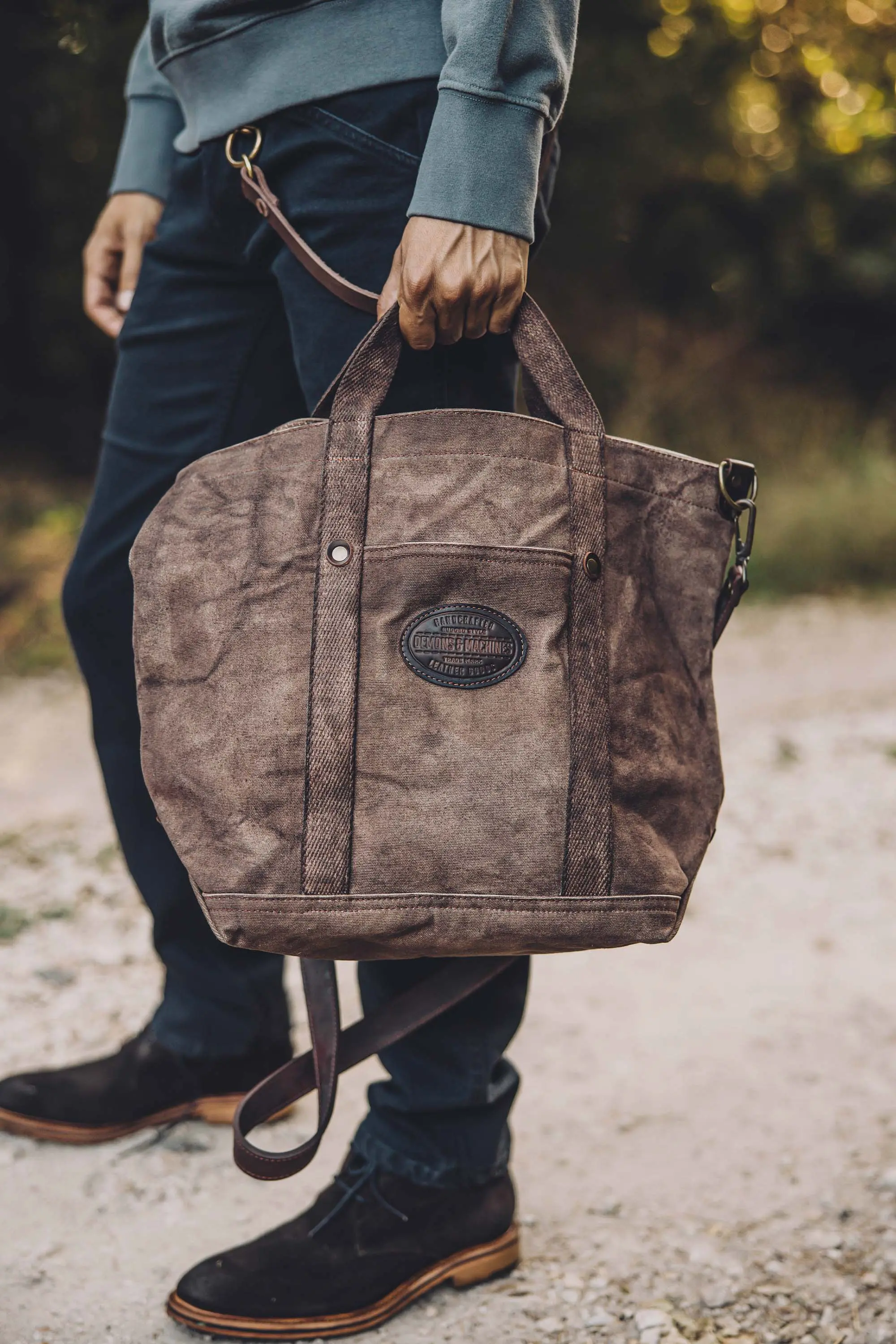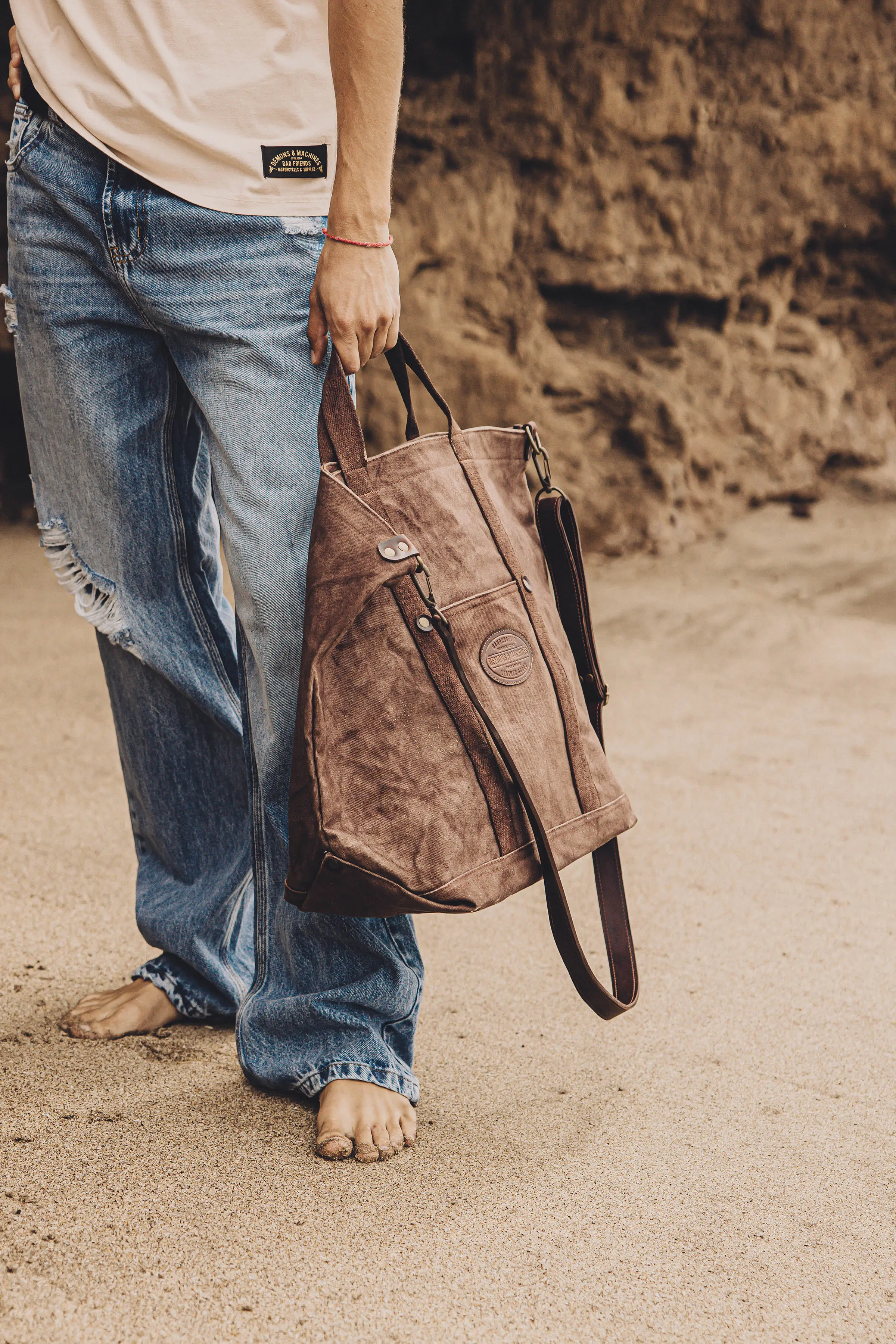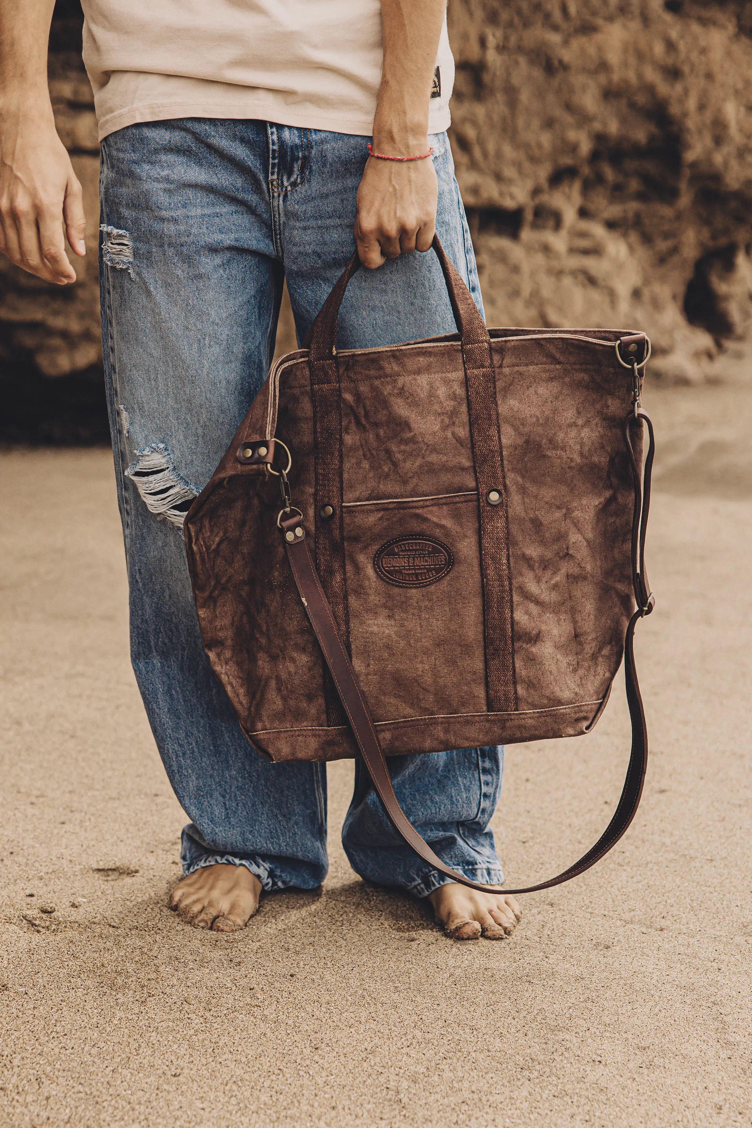 Bolso confeccionado en panamá de algodón, teñido en pieza terminada y encerado artesanalmente logrando impermeabilizar el producto y hacerlo repelente al agua.