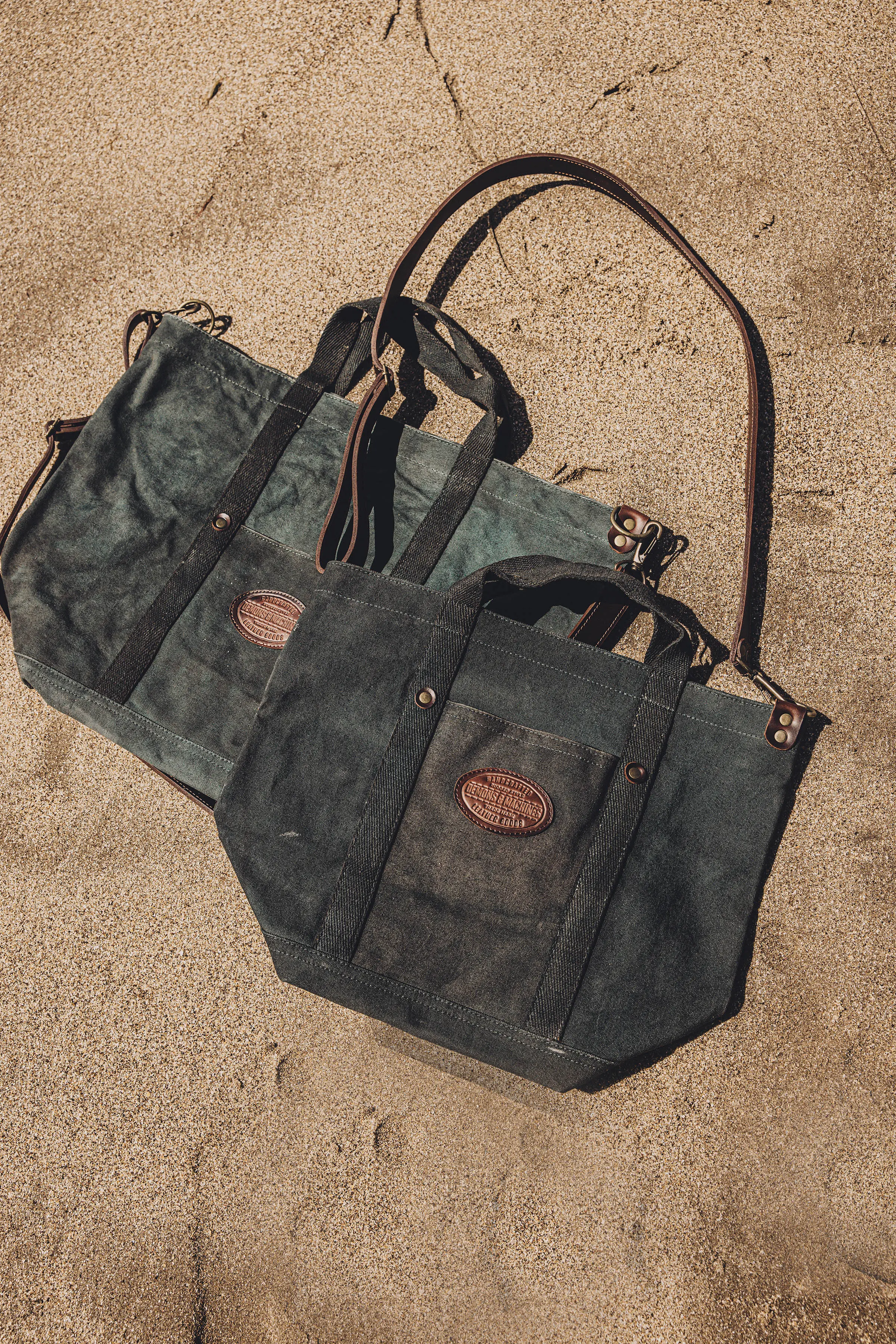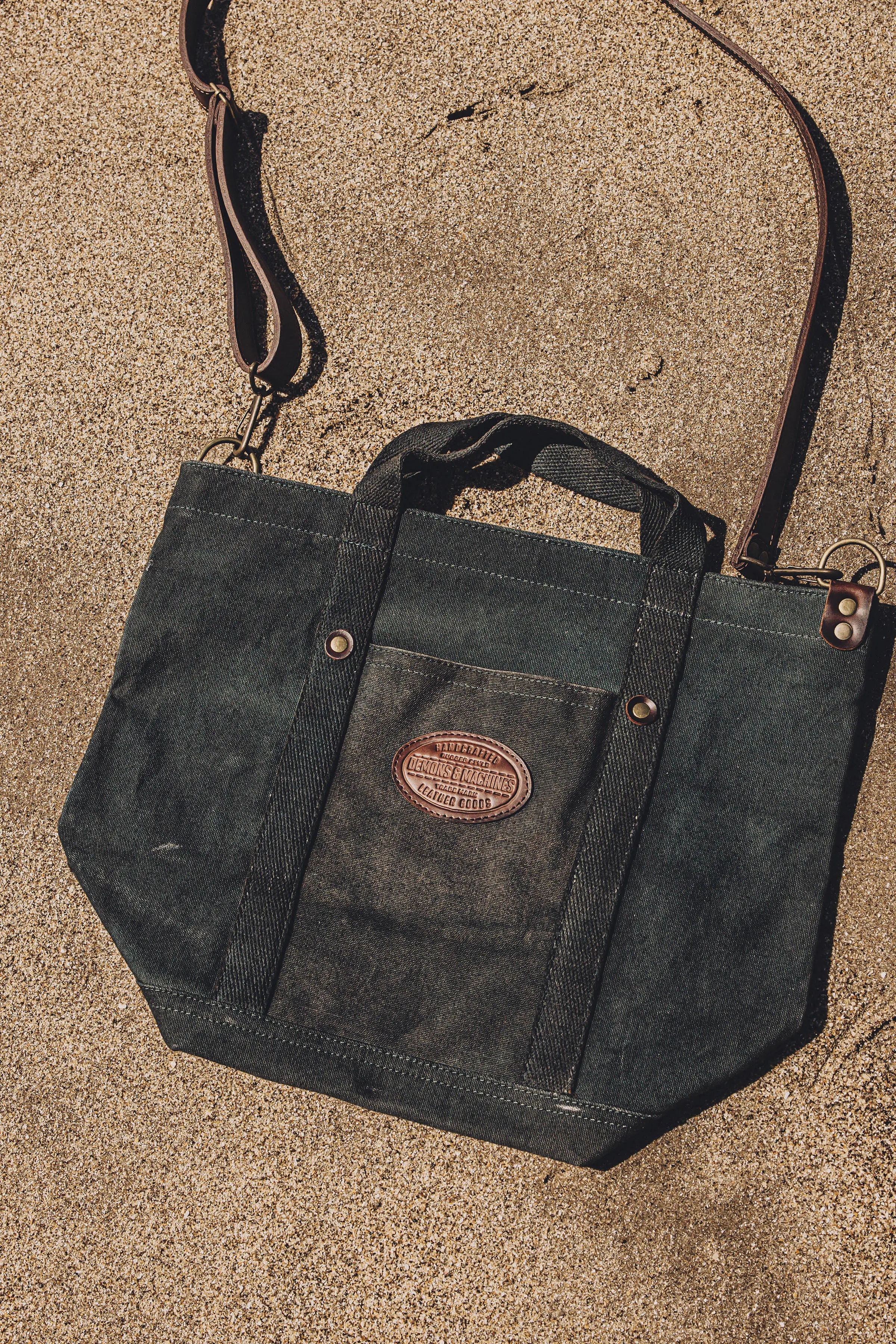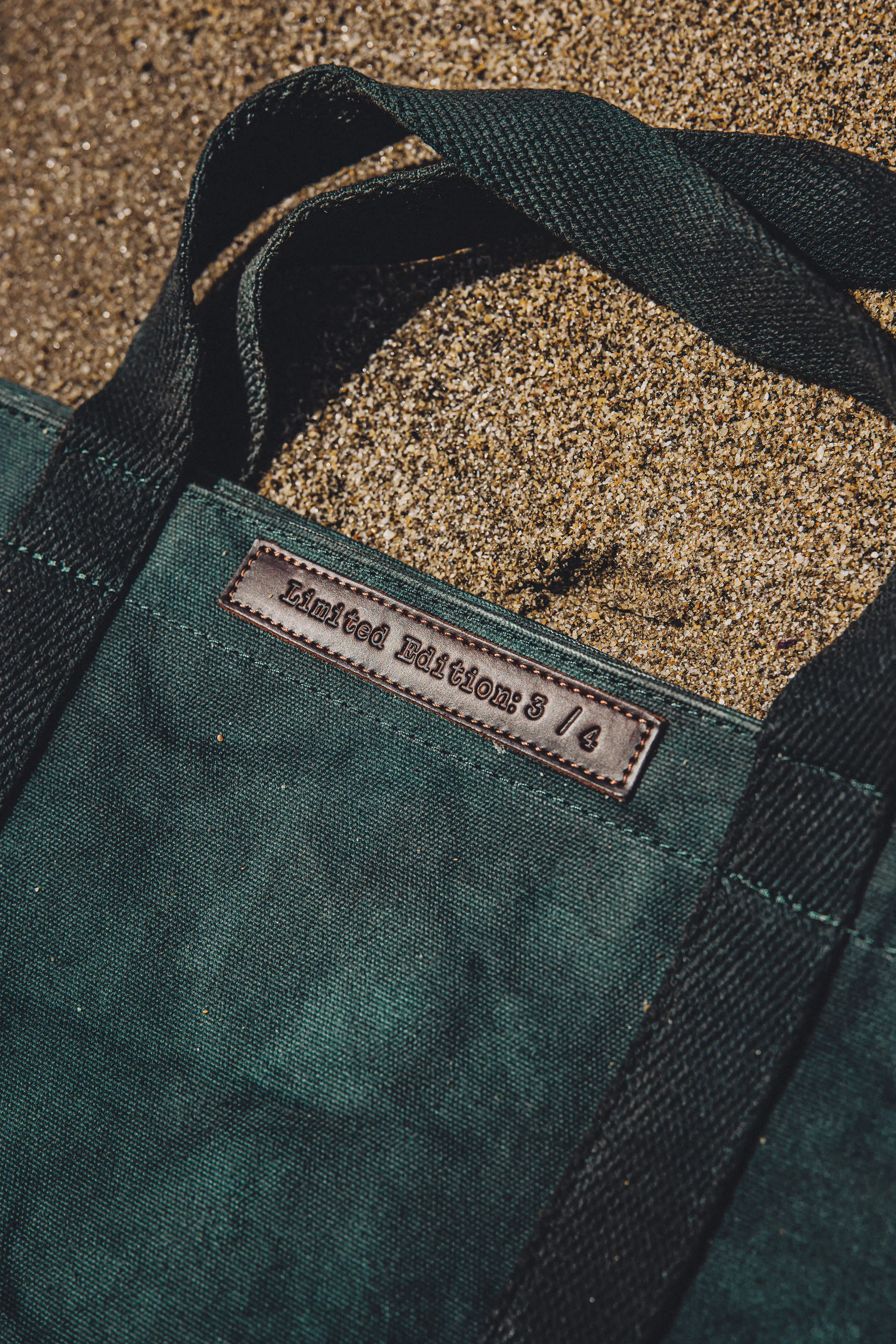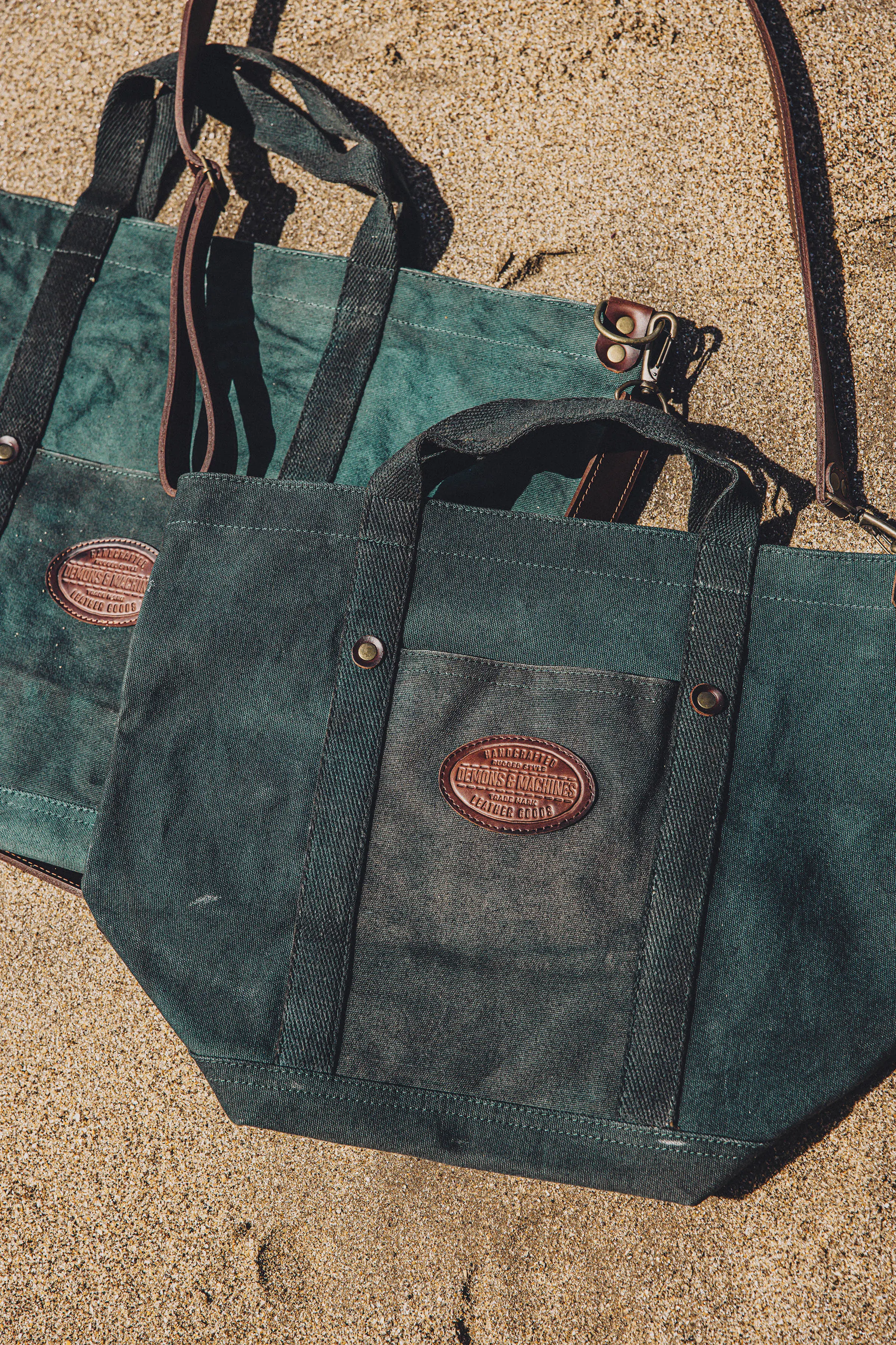 Bolso confeccionado en panamá de algodón, teñido en pieza terminada y encerado artesanalmente logrando impermeabilizar el producto y hacerlo repelente al agua.