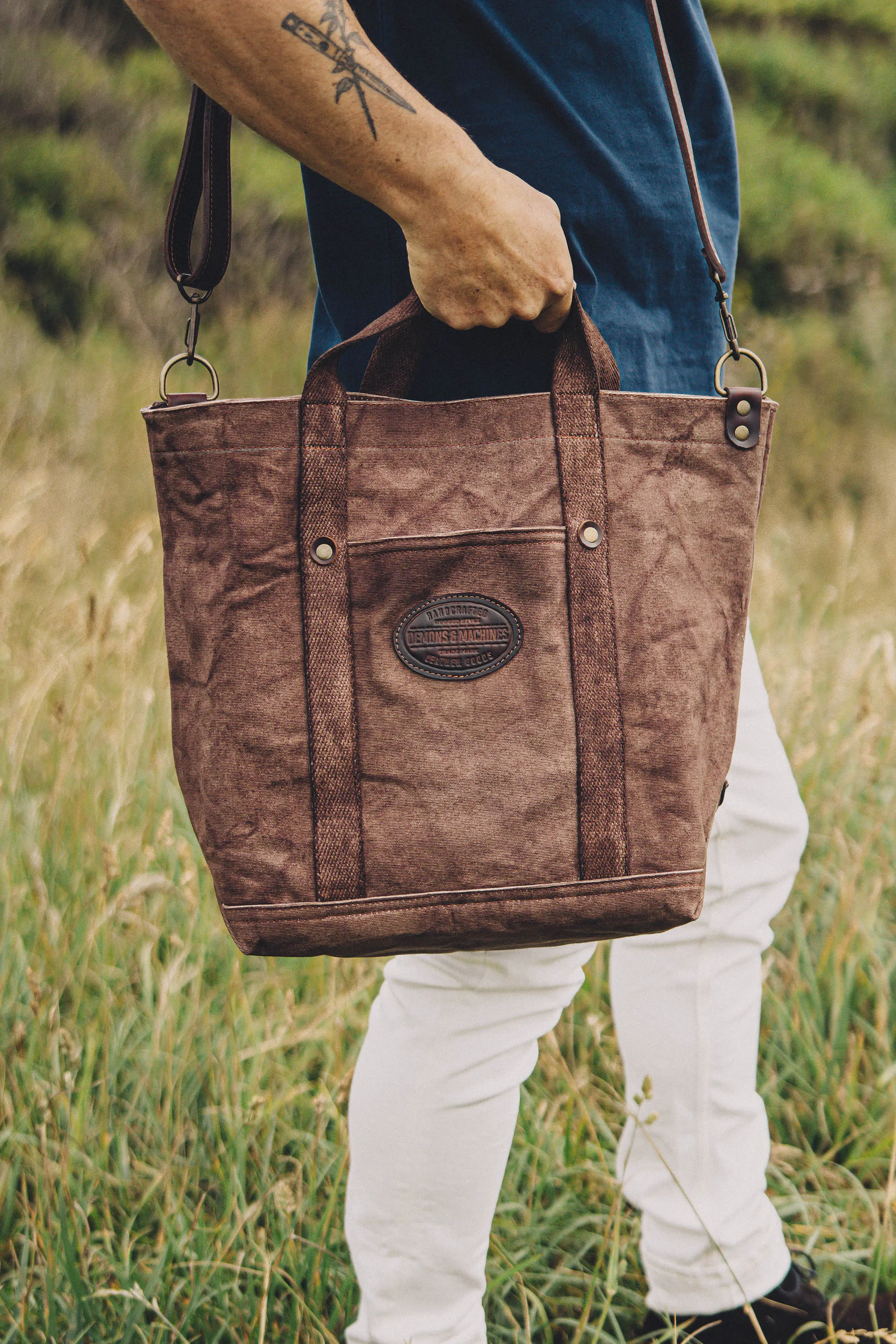 Bolso confeccionado en panamá de algodón, teñido en pieza terminada y encerado artesanalmente logrando impermeabilizar el producto y hacerlo repelente al agua.