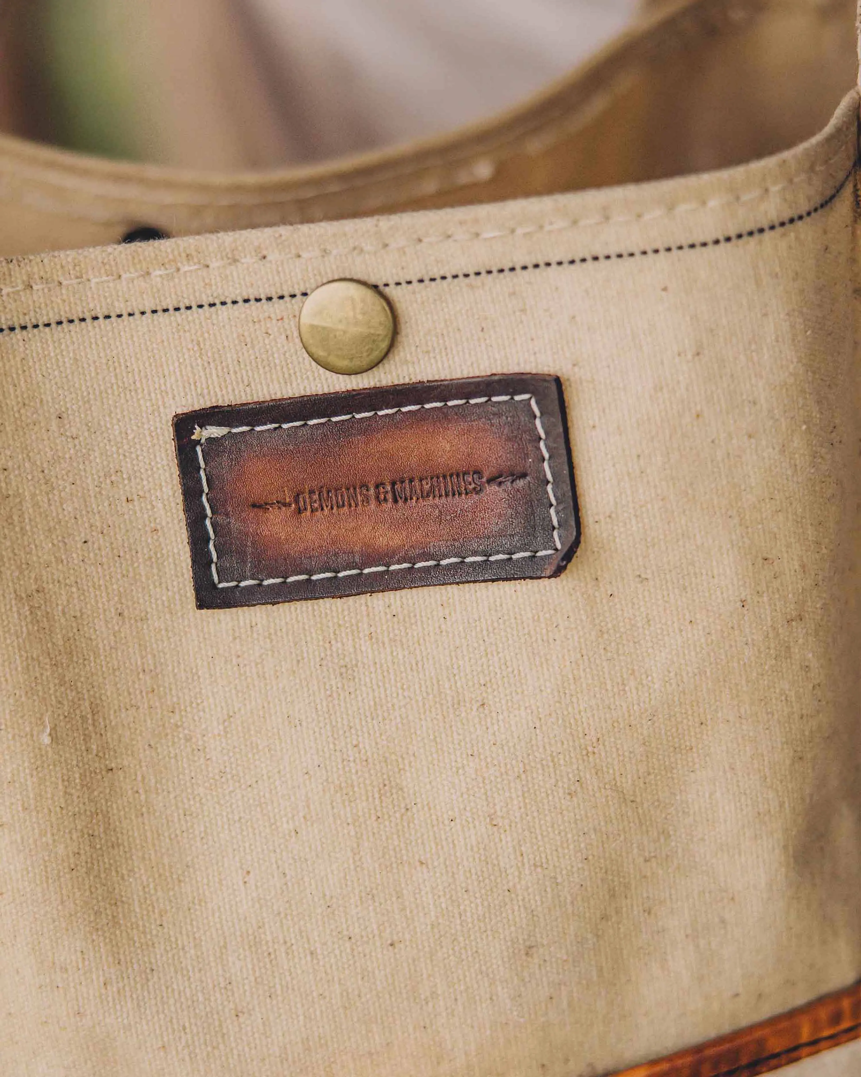 Bolso estilo tote confeccionado en lona pesada de algodón con correas reforzadas, bolsillo externo envivado en cuero vacuno, broches suizos baño bronce, y terminación encerada sobre producto terminado.