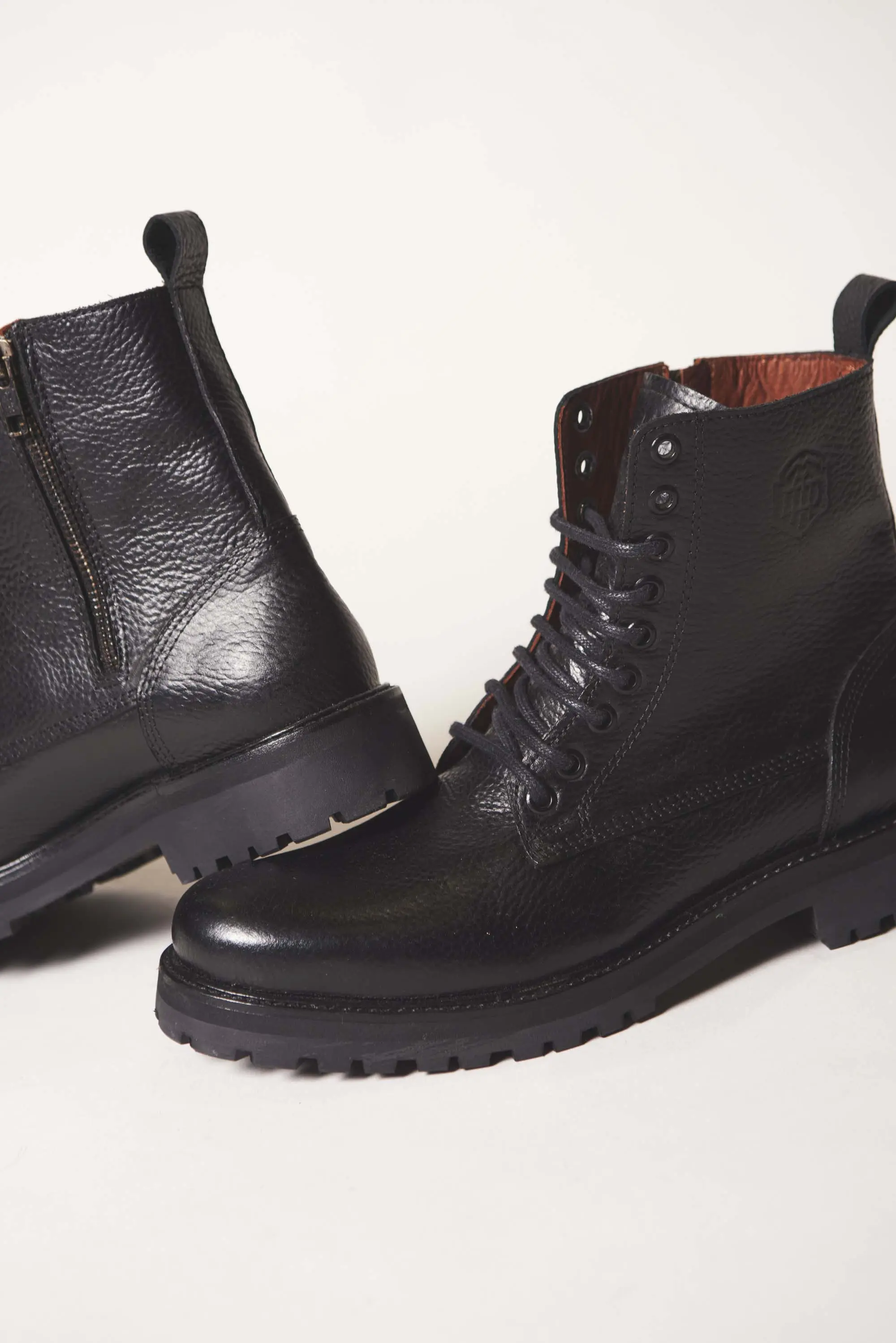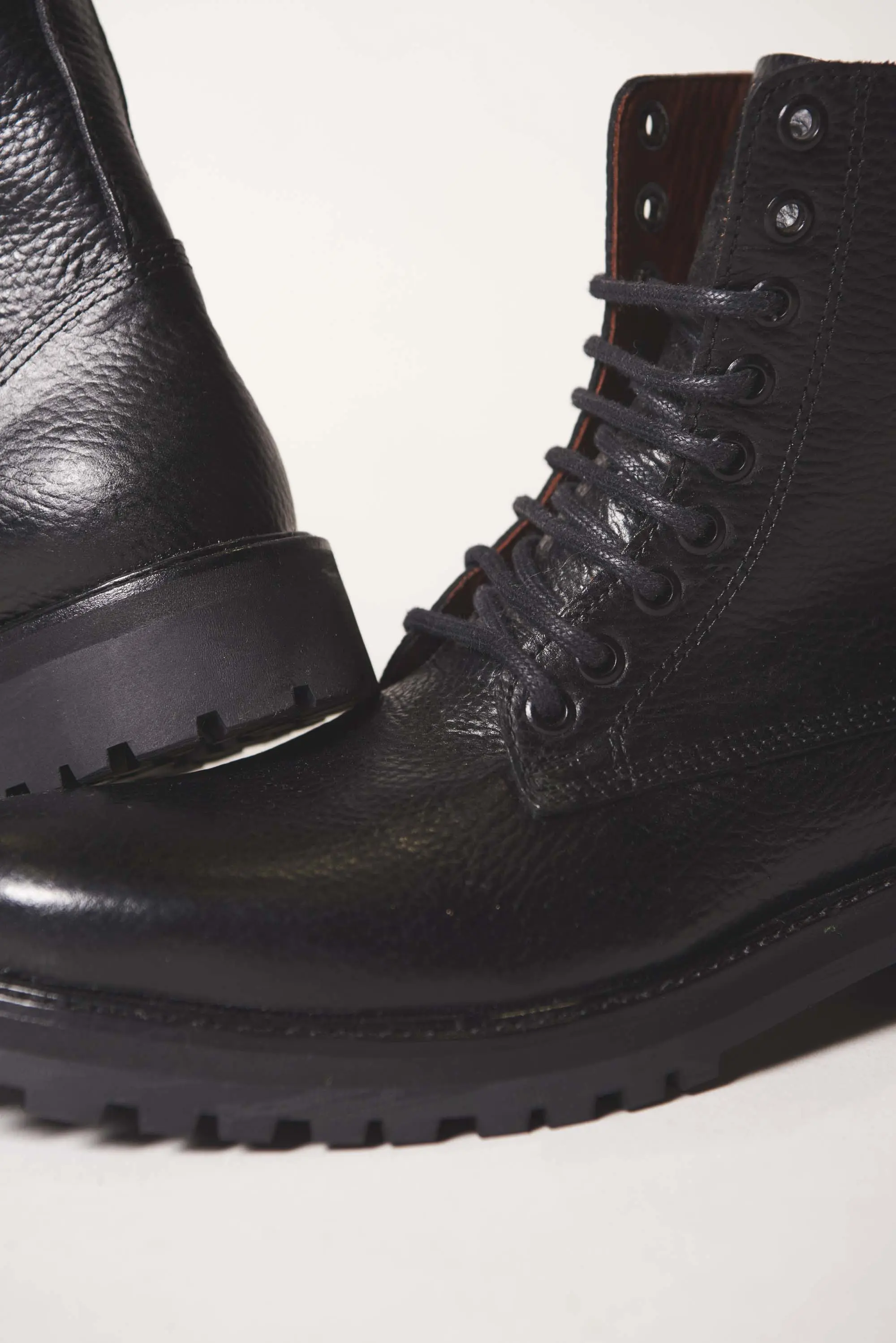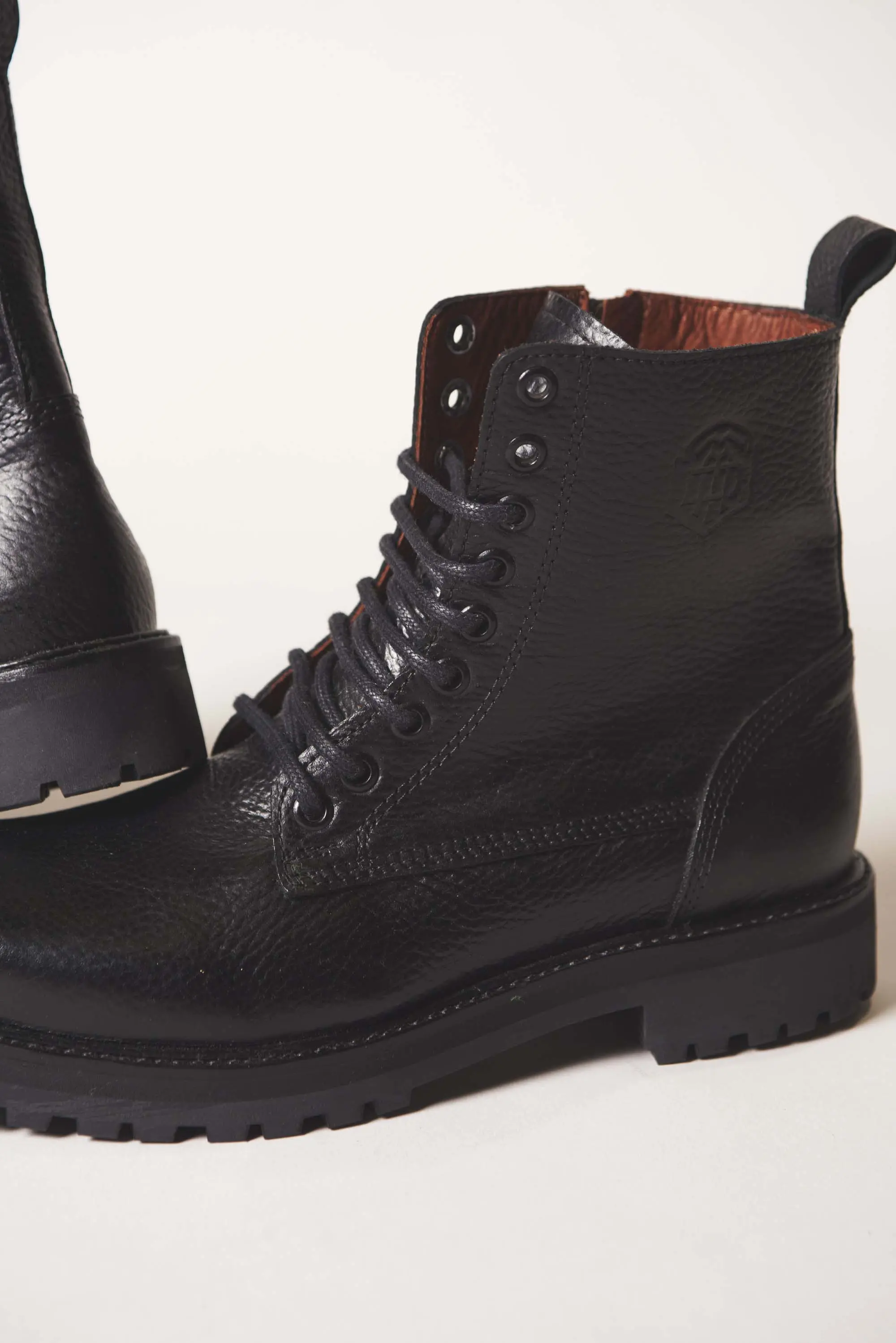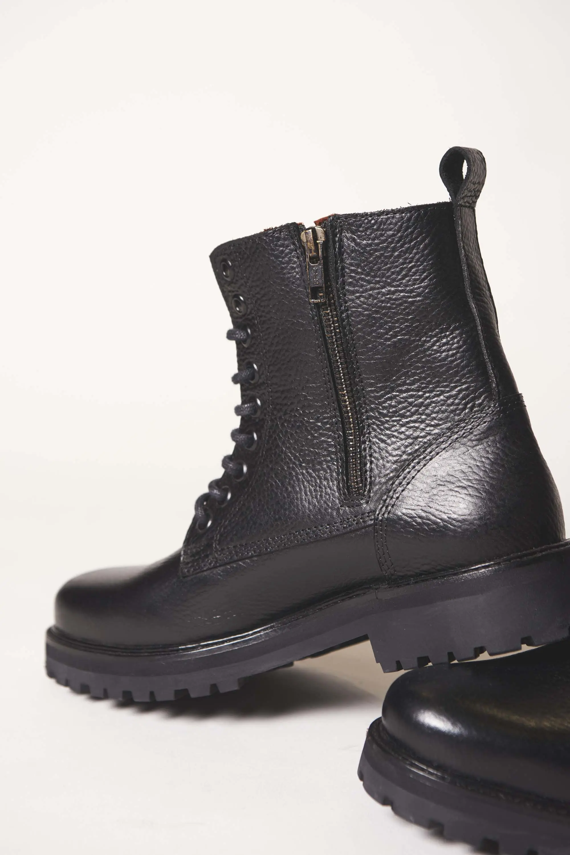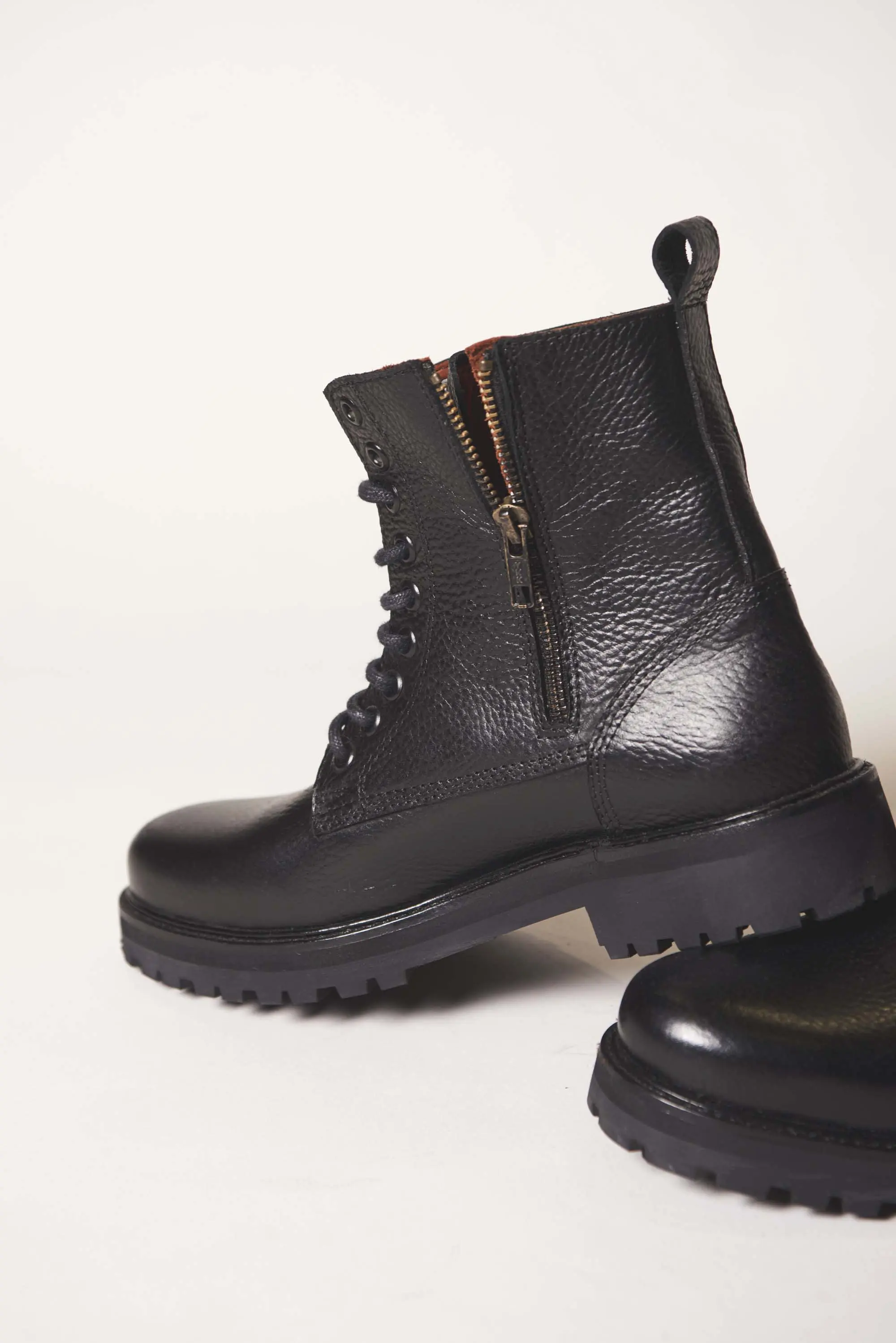 Borcego de caña alta en cuero vacuno graneado, con cierre lateral de metal bronce empavonado. Cordones tubulares al tono y ojales de metal con baño bronce empavonado. Logo de marca grabado en bajo relieve en cara externa y talón interno. Base estilo tractor de caucho cosida.