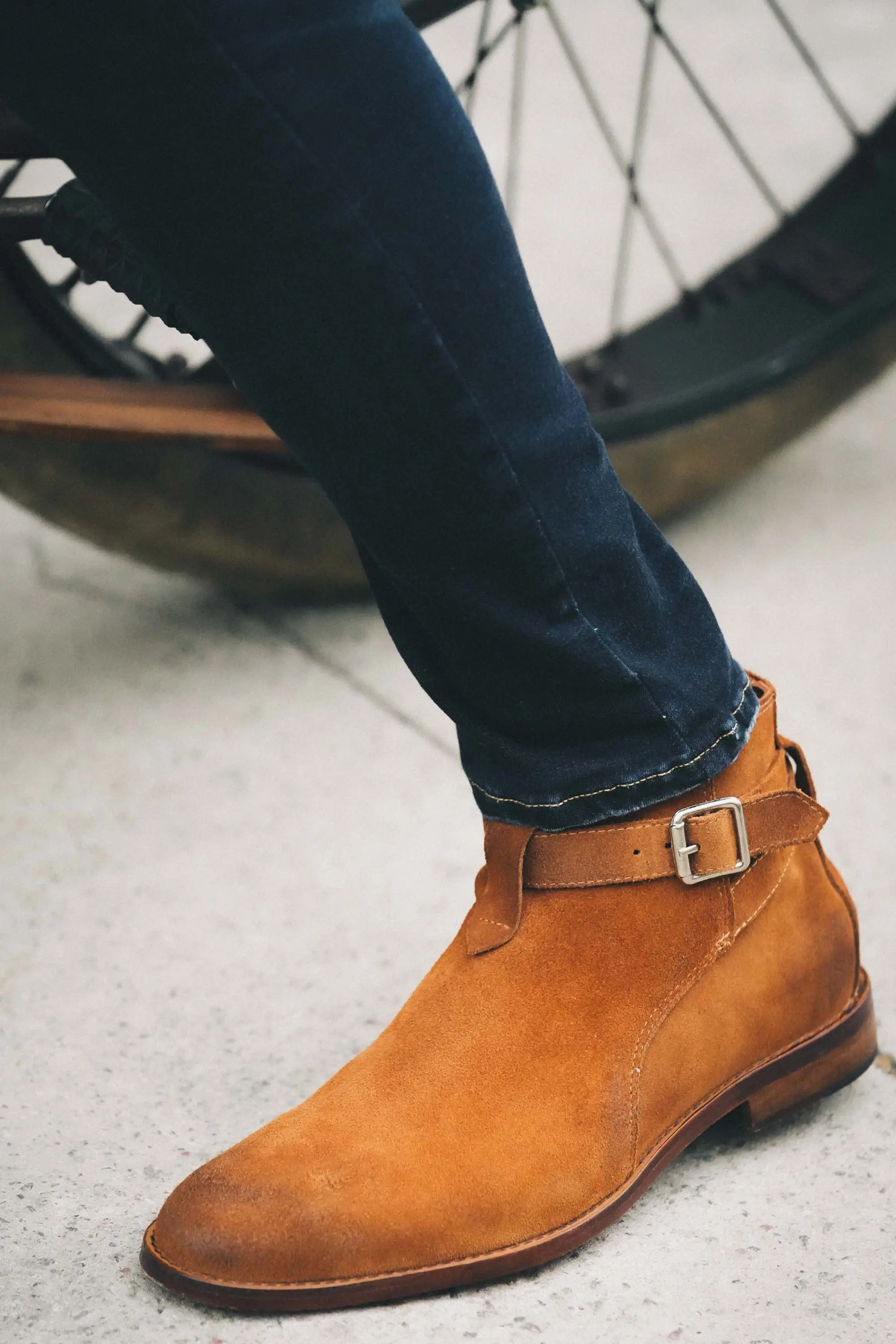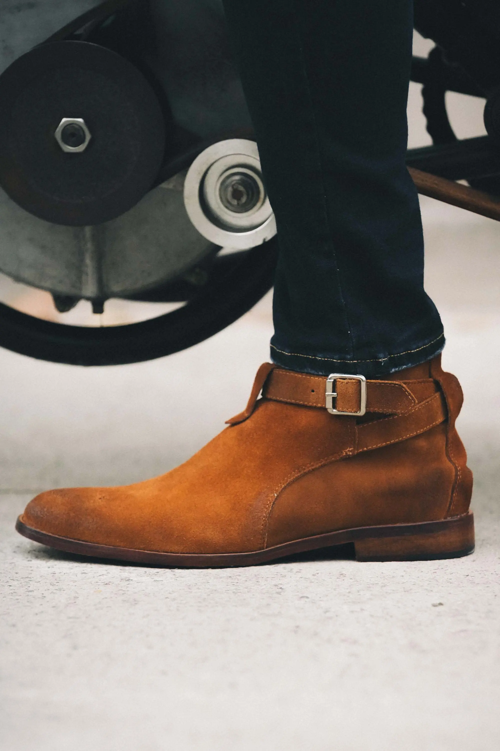 Bota de caña media alta en cuero descarne gamuzado, con cinto ajustable y hebilla de metal niquelada. Logo de marca grabado en bajo relieve en talón interno y suela en cuero vacuno al tono.