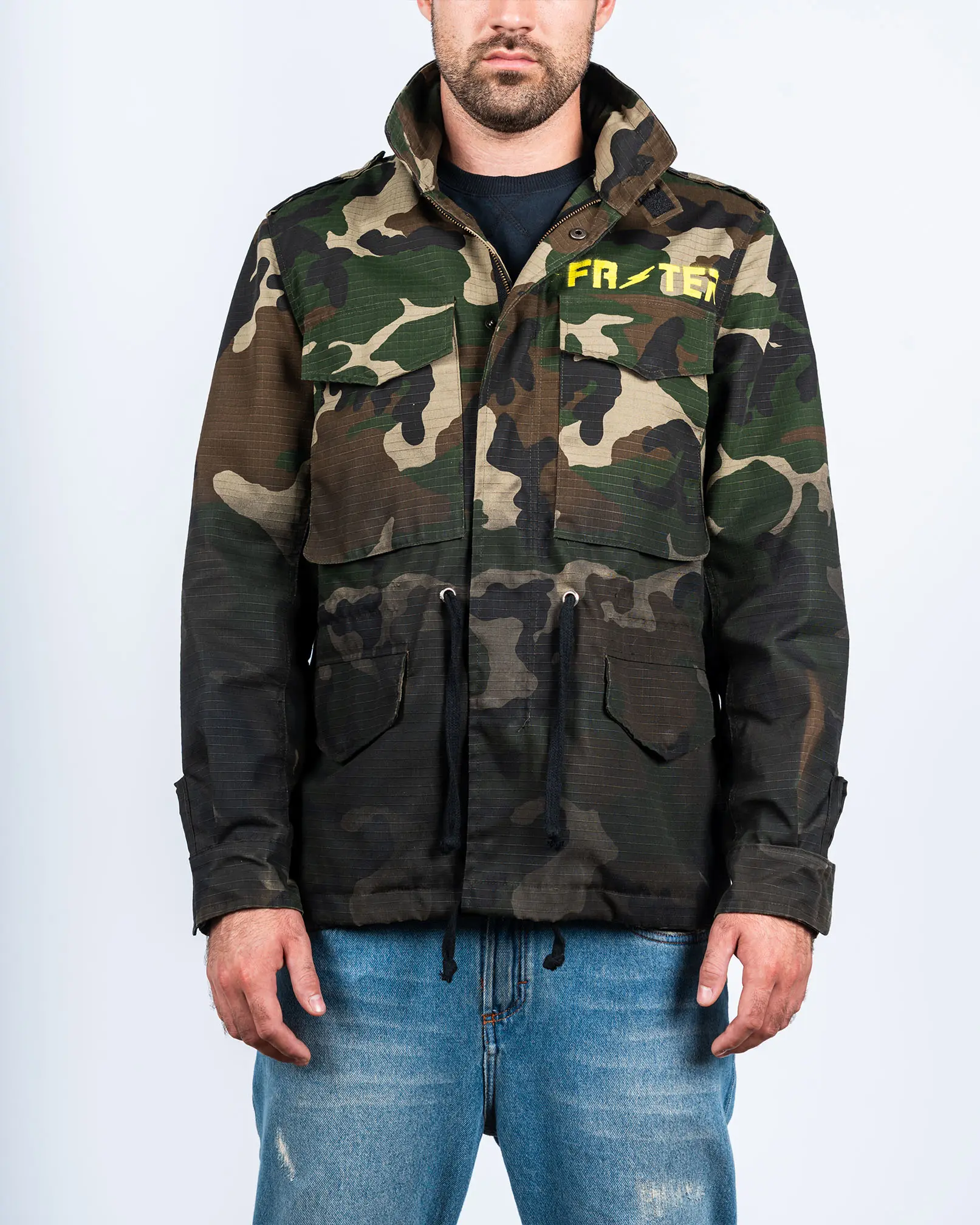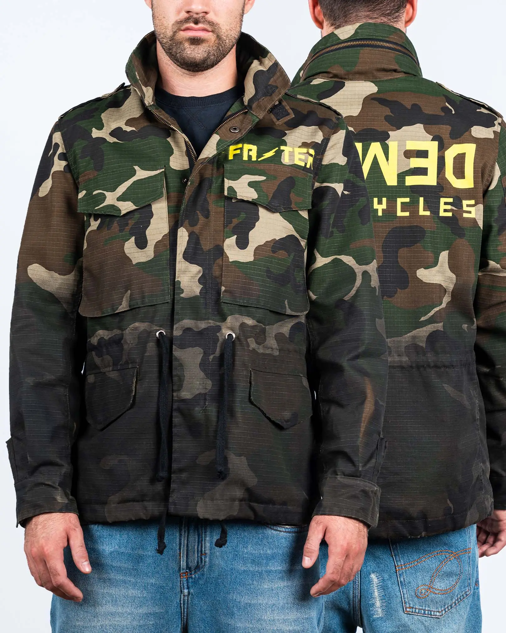 Campera confeccionada en tela Rip Stop. De calce recto y largo a media cadera, con cordón ajustable en la cintura y en bajo ruedo. Cuello alto, acceso con cierre y broches snaps, charreteras con pespunte en cruz. Interno en forrería sintética. Muy funcional: Dos bolsillos superiores con fuelle y tapa, dos bolsillos inferiores con tapa y un bolsillo ojal interno. Cuenta con capucha oculta en el cuello mediante cierre cadena 10. Estampa de marca con serigrafía tanto al frente como en la espalda. Aerografiado irregular en bajo ruedo con tinta cubritiva.