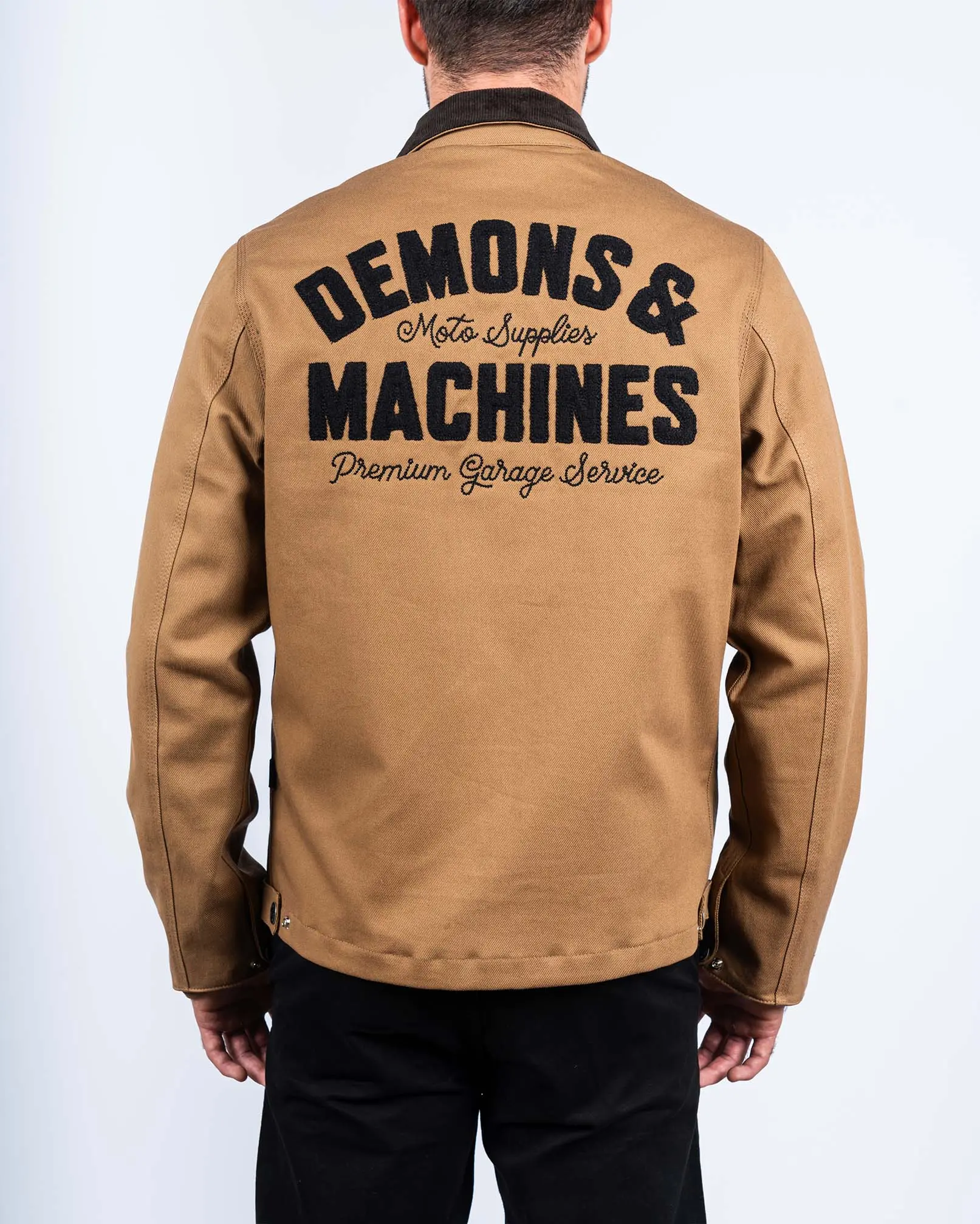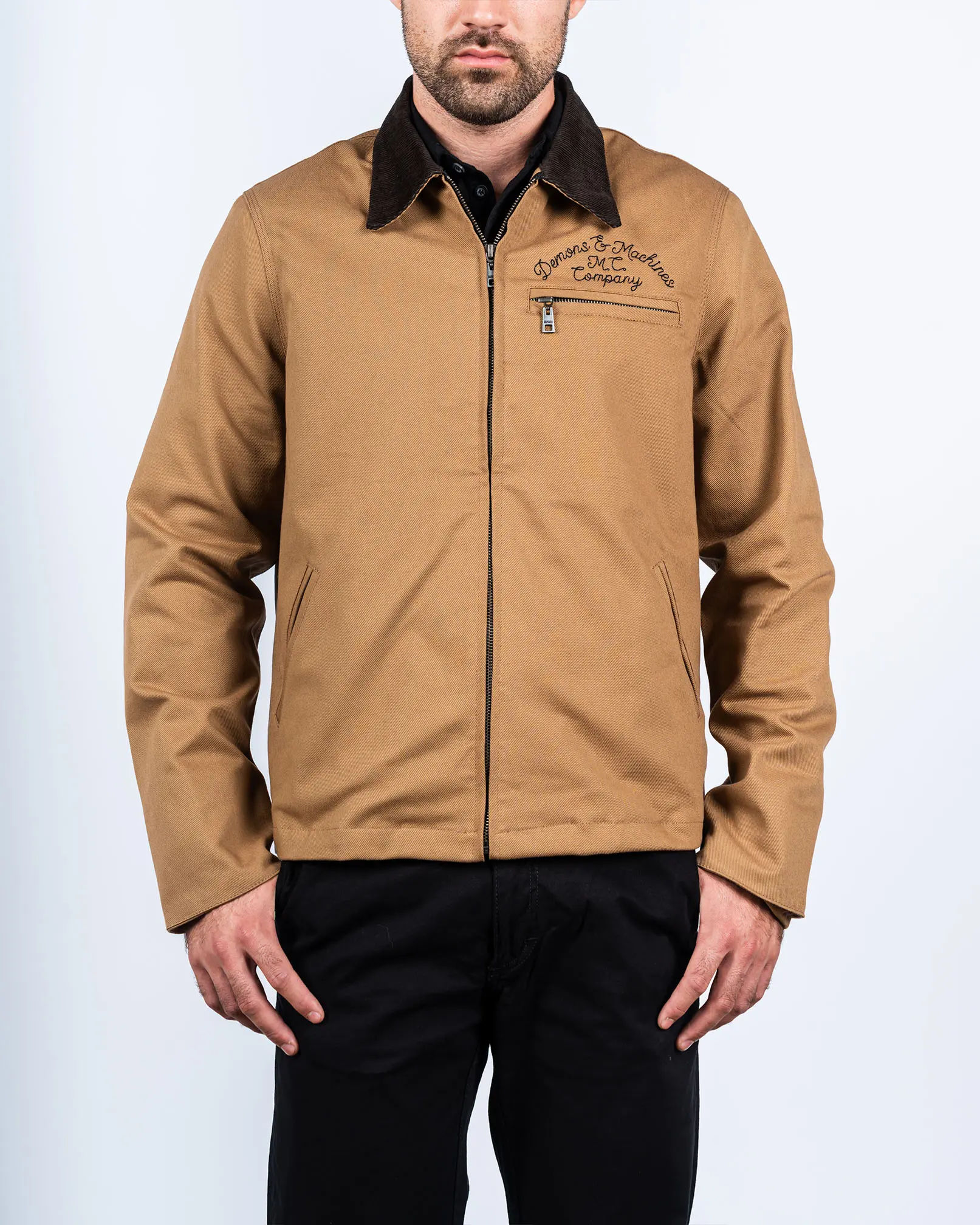 Campera confeccionada en bull pesado de algodón. De corte regular e inspirada en una clásica chaqueta de trabajo, tiene cuello combinado en corderoy de 11 bastas, cierre metálico y bolsillos ojal al frente. Cintura y puños ajustables con broches suizos de metal marcarios. Bolsillo plaqué interno en bull. Bordado de marca en puntada cadeneta al frente y arte bordado con letras sobre paño de lana en la espalda. Forrería de algodón poliéster de peso mediano, con mano suave y buen deslizamiento que evita los desgarros.