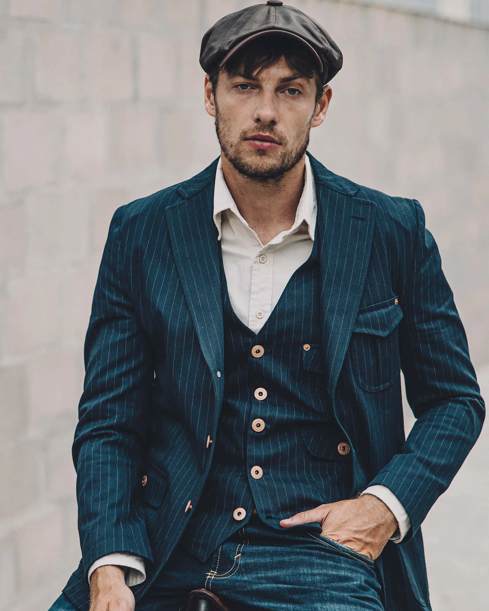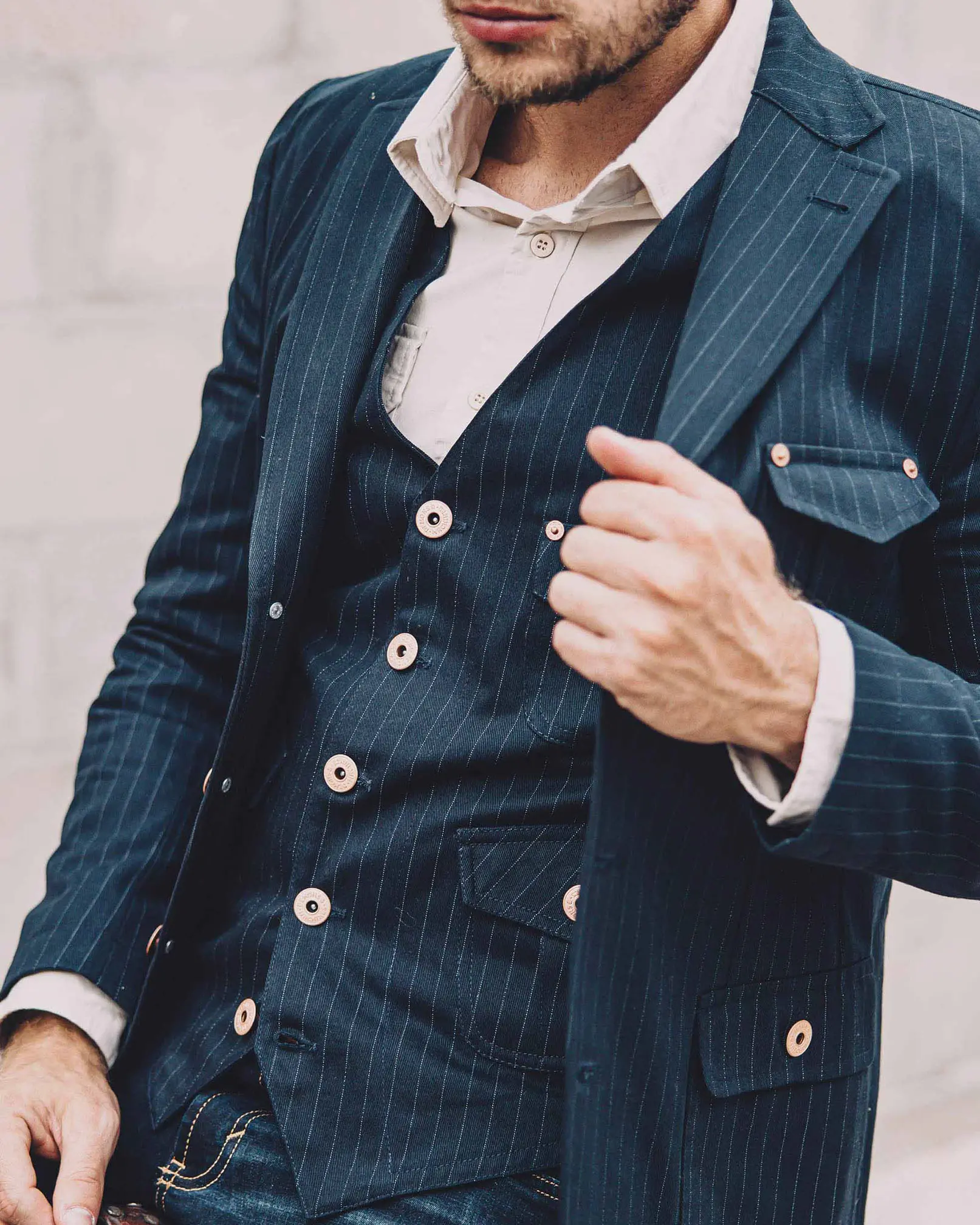 Chaleco sastrero confeccionado en gabardina de algodón rayado para un look descontracturado, con 5 botones jeaneros al frente. Bolsillos plaqué inferiores con tapa y tablón central + bolsillo superior con remaches jeaneros. Tajo en espalda. Interno mangas con forrería sintética para un mejor deslizamiento. 100% Algodón