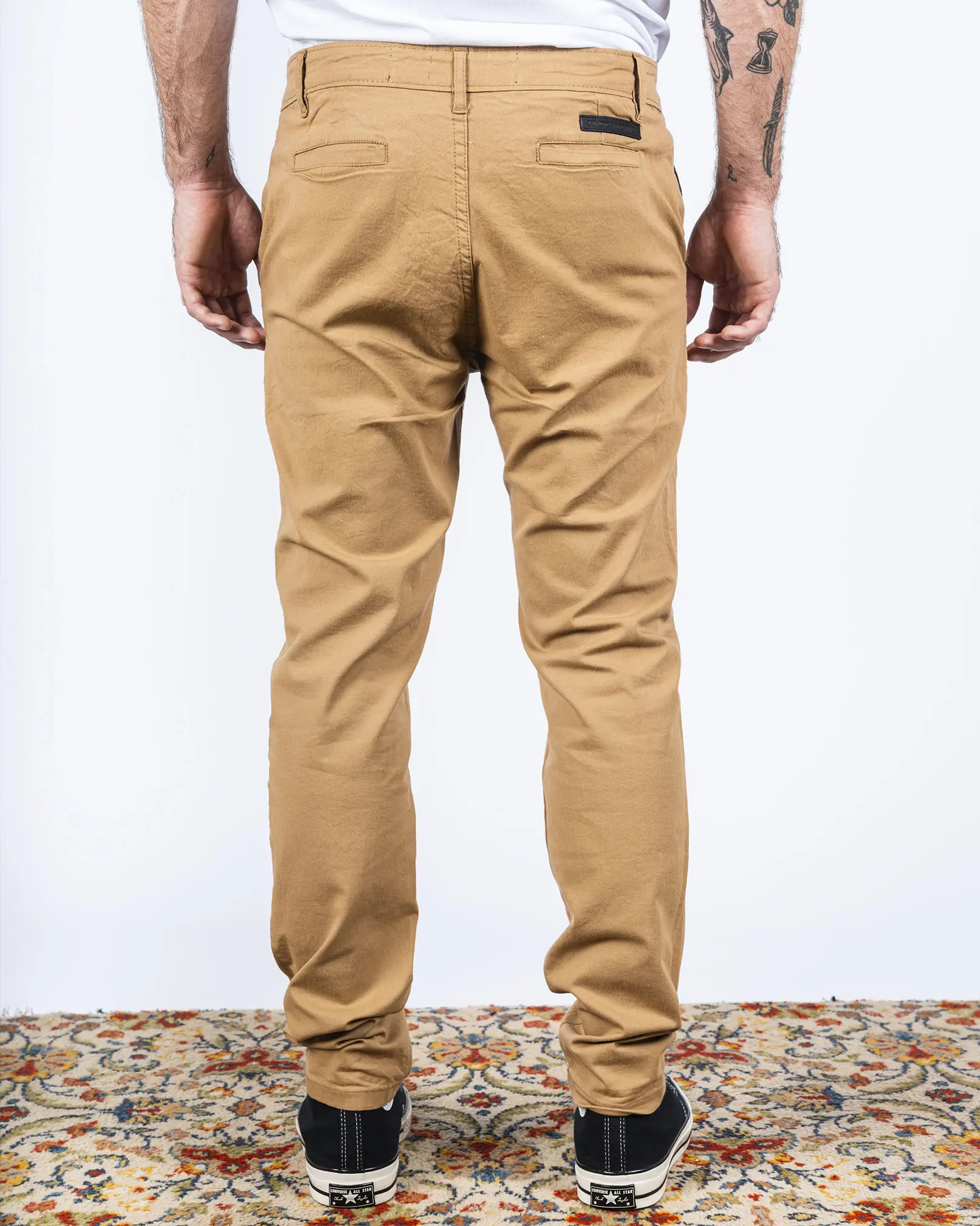 Pantalón chino de corte clásico recto, confeccionado en gabardina elastizada. Cintura con botón y cremallera, pasacintos, bolsillos ojal y pinzas en trasero.