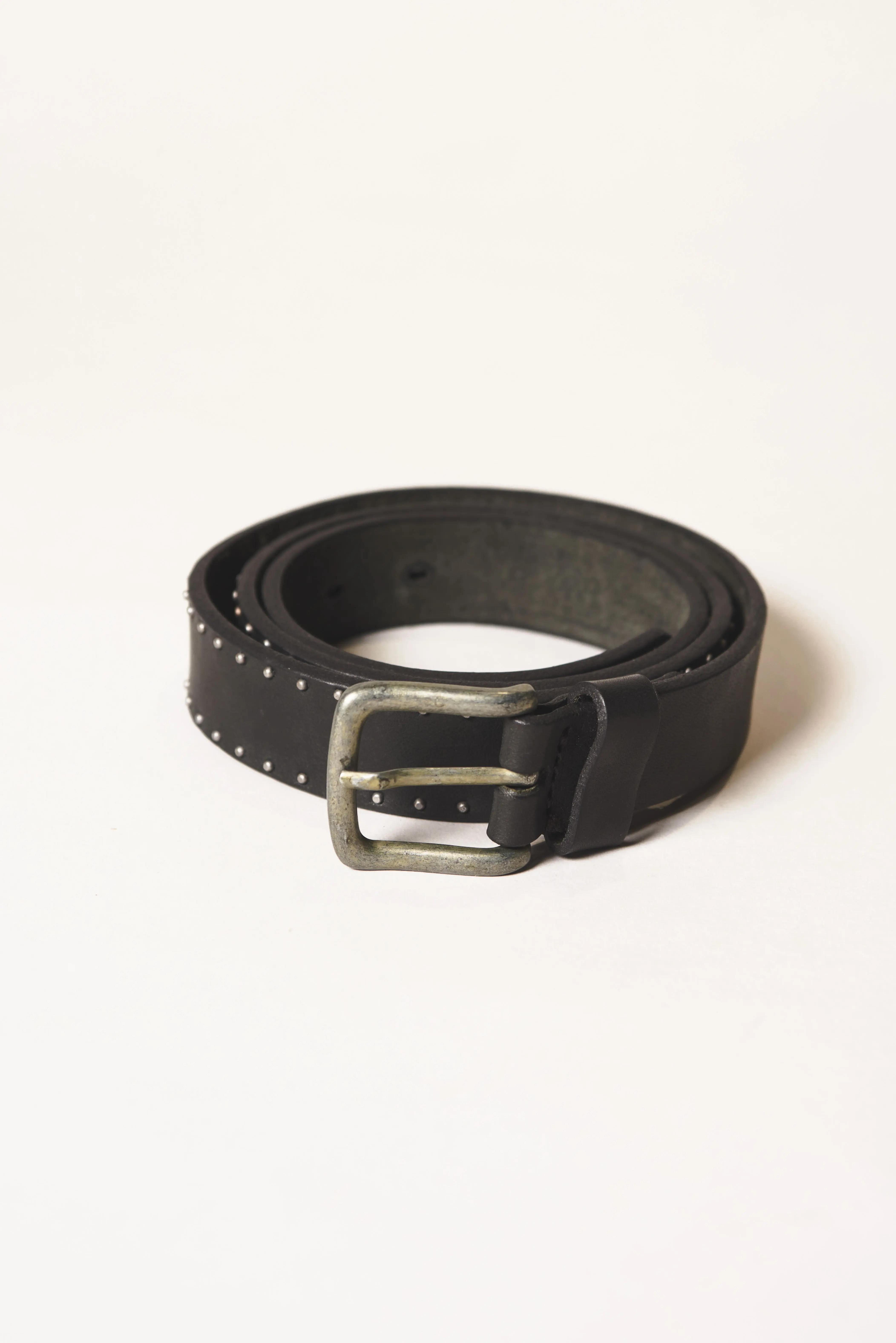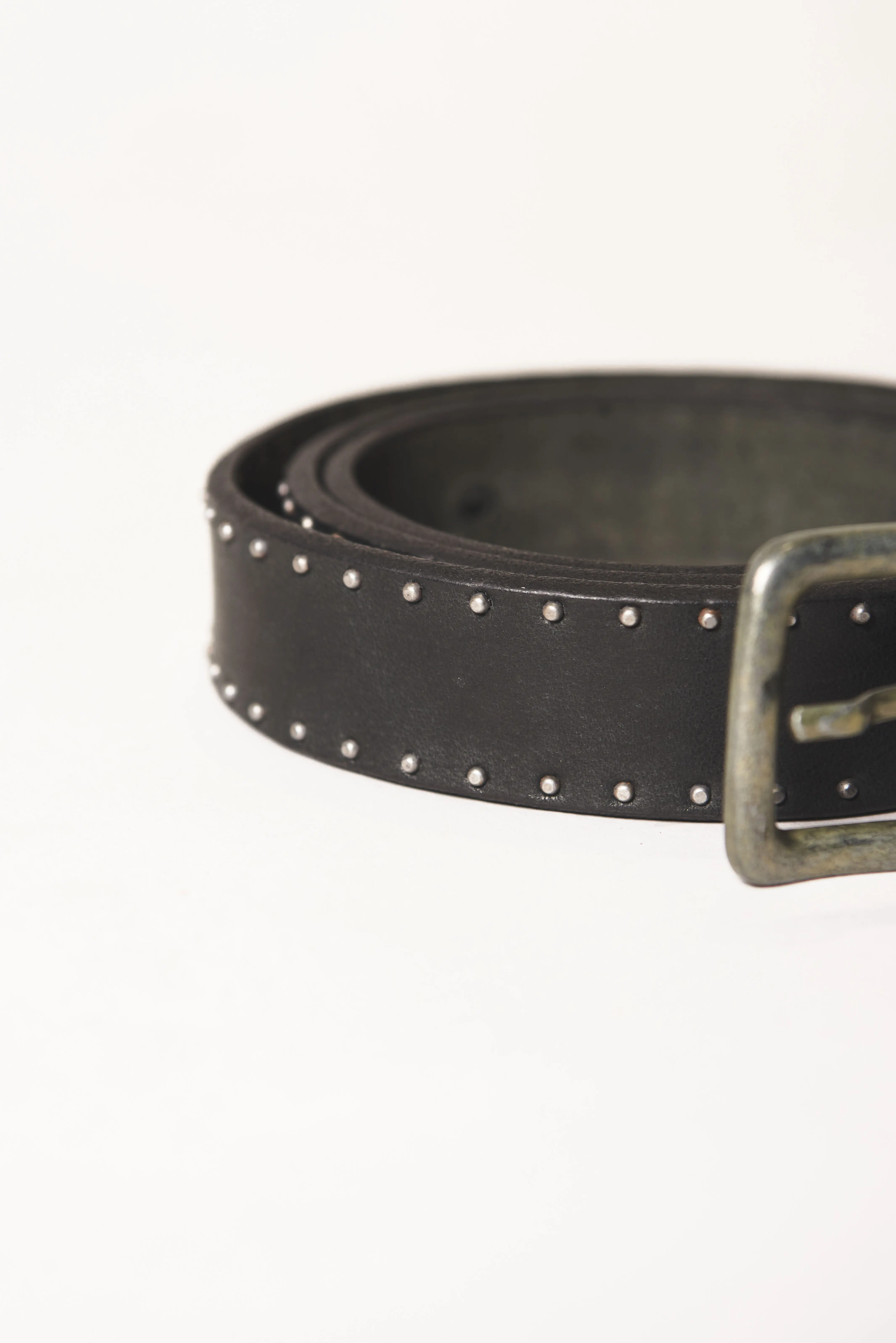 Cinturón con lonja de cuero vacuno con micro tachas en las orillas. Hebilla metálica en baño plata vieja.