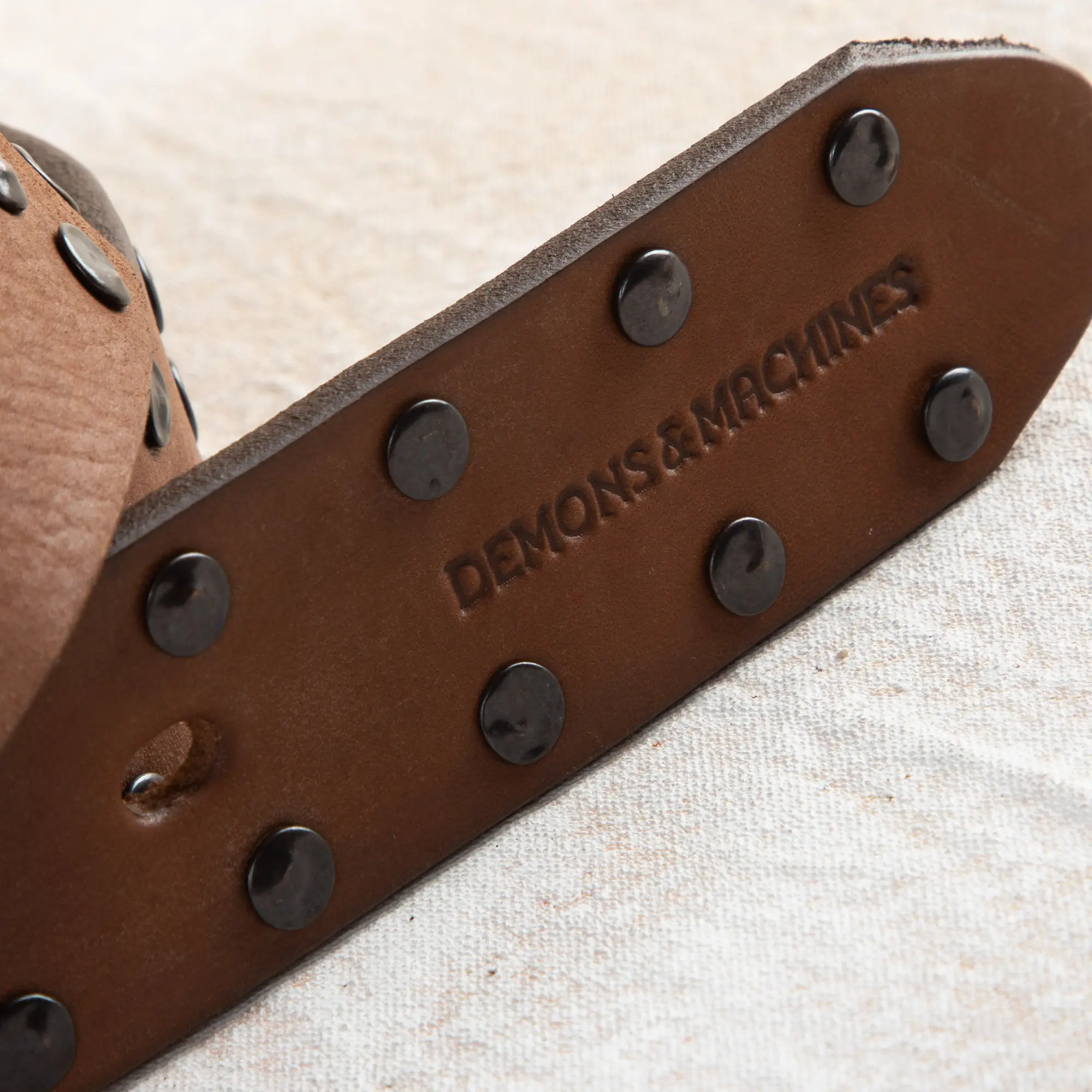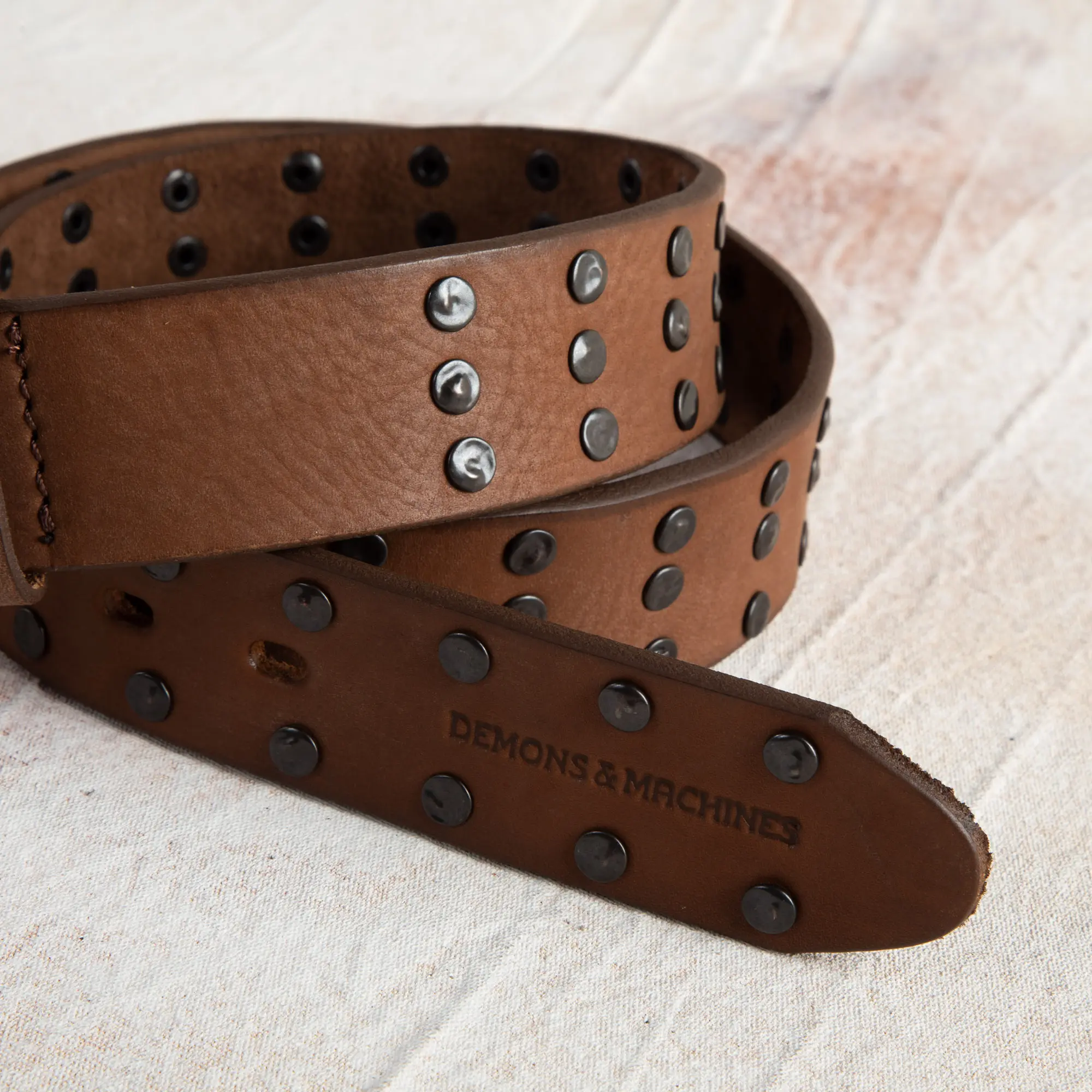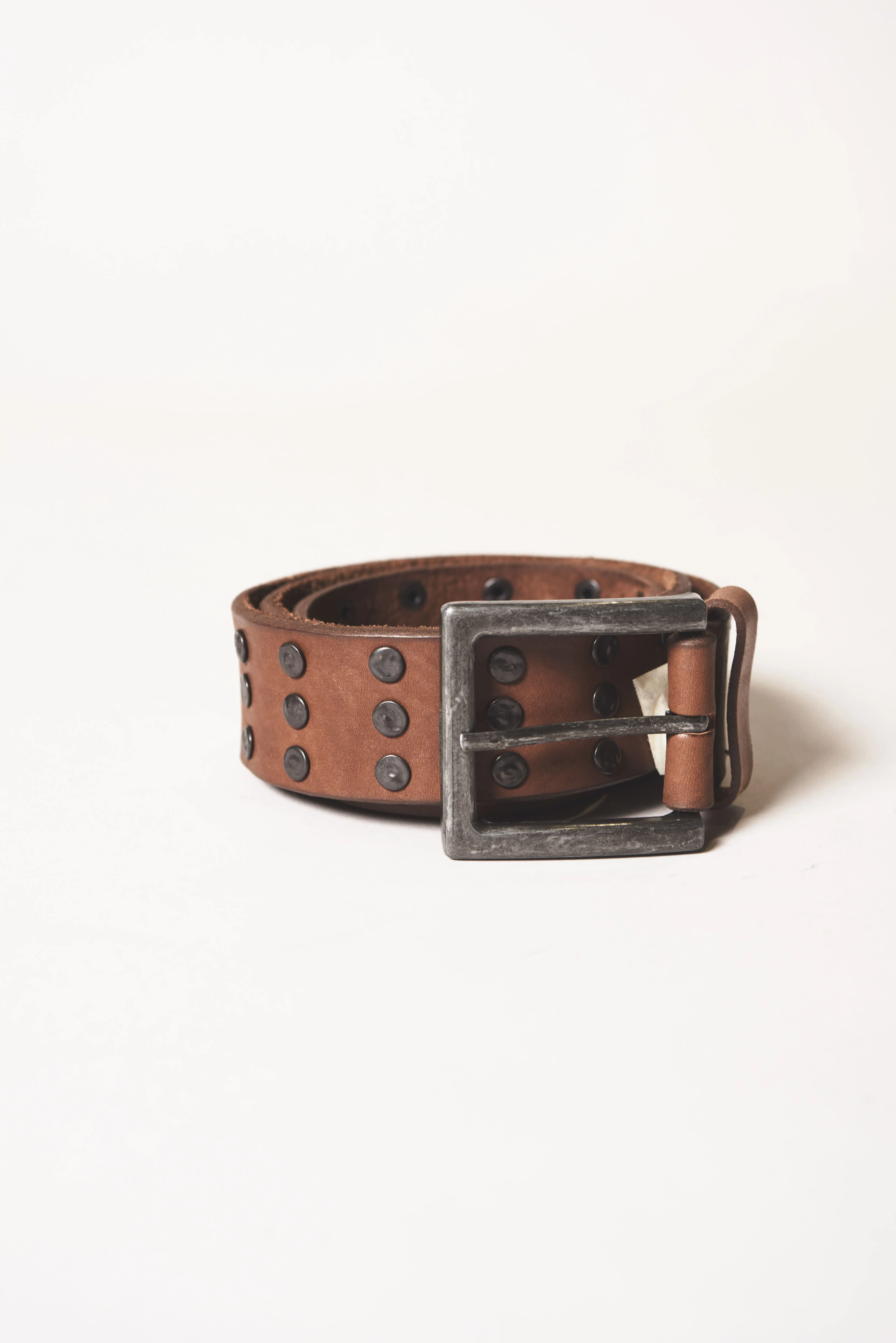 Cinturón con lonja de cuero vacuno con doble fila de tachas golpeadas. Hebilla metálica en baño plata vieja.