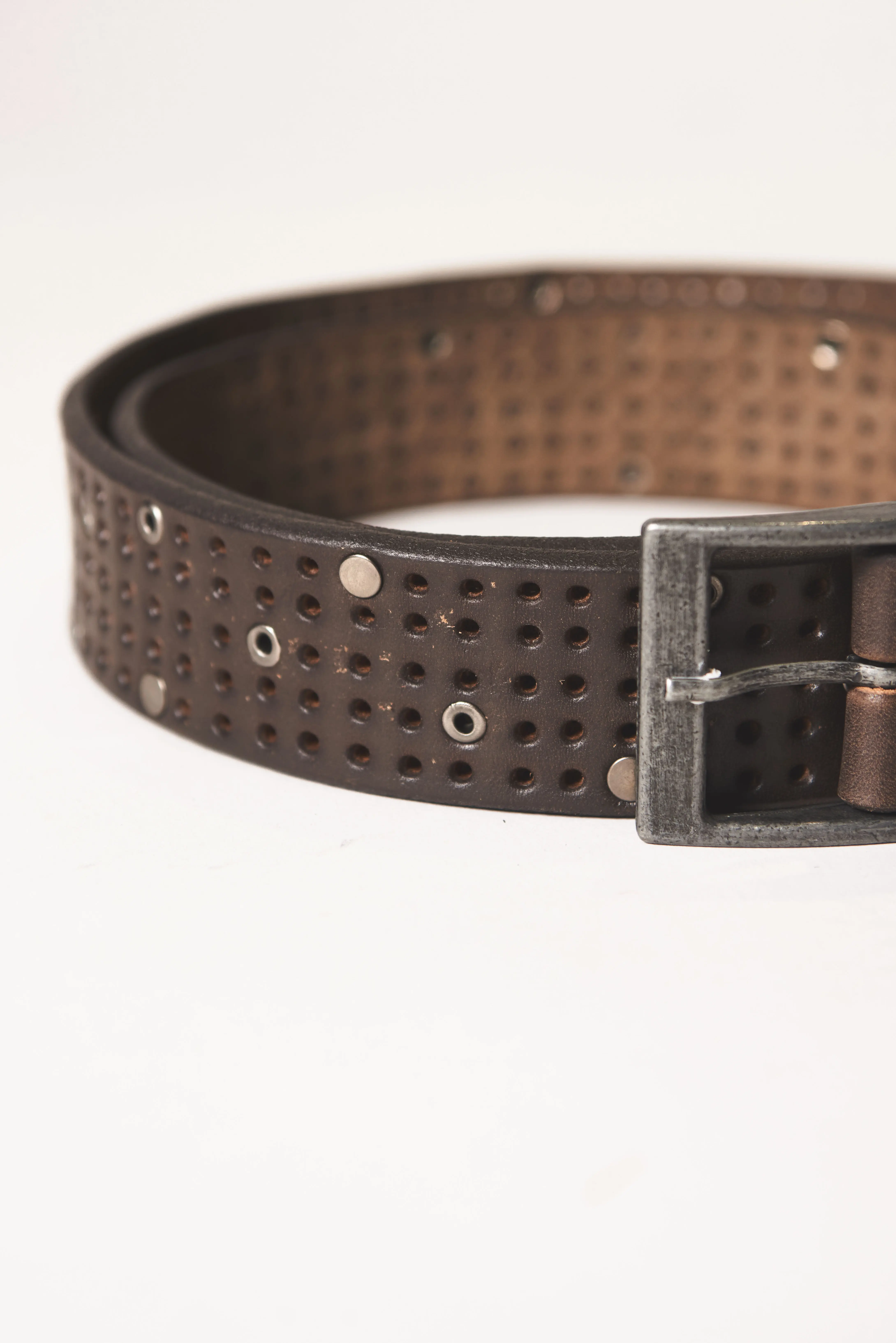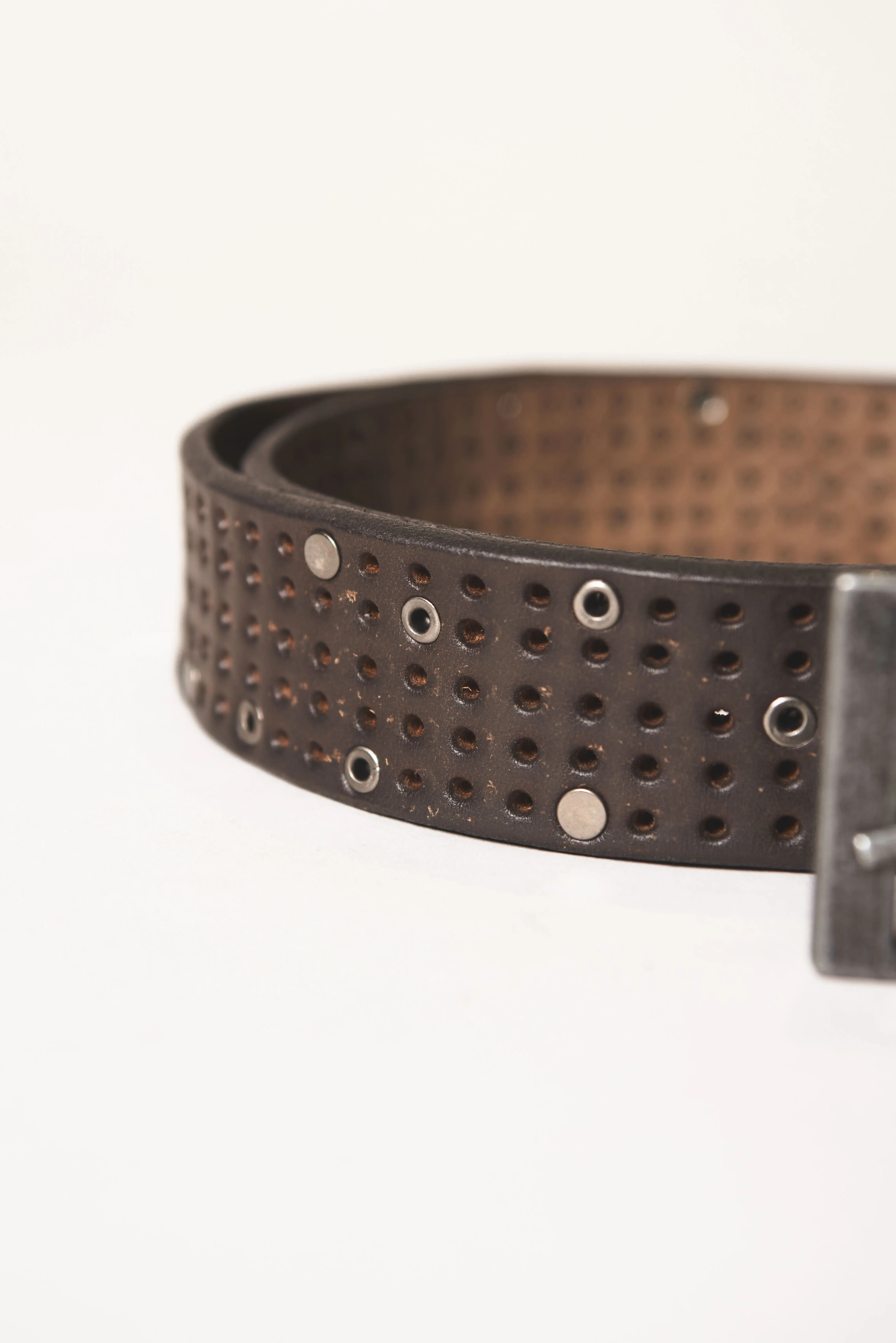 Cinturón con lonja de cuero vacuno con remaches random. Hebilla metálica en baño plata vieja.