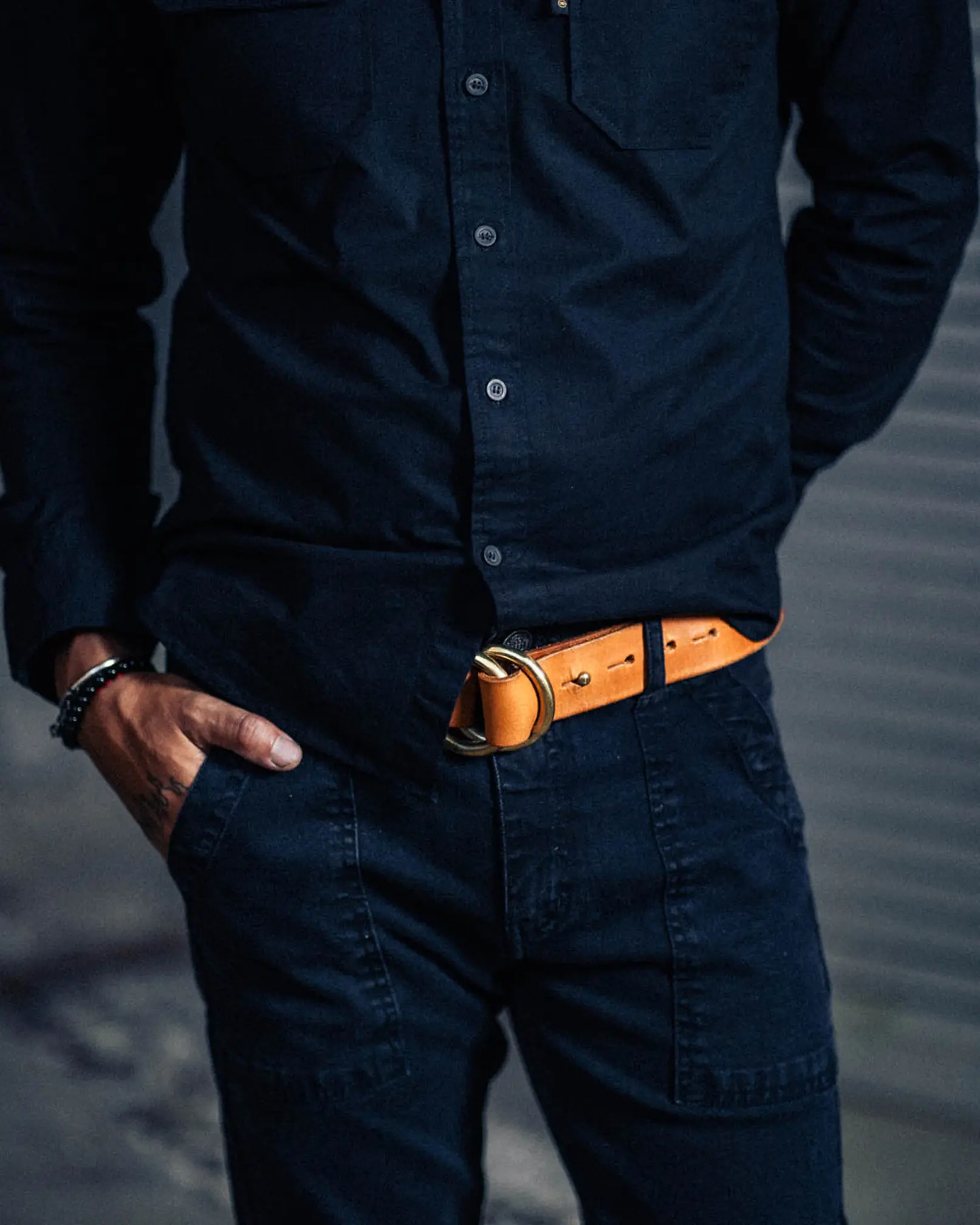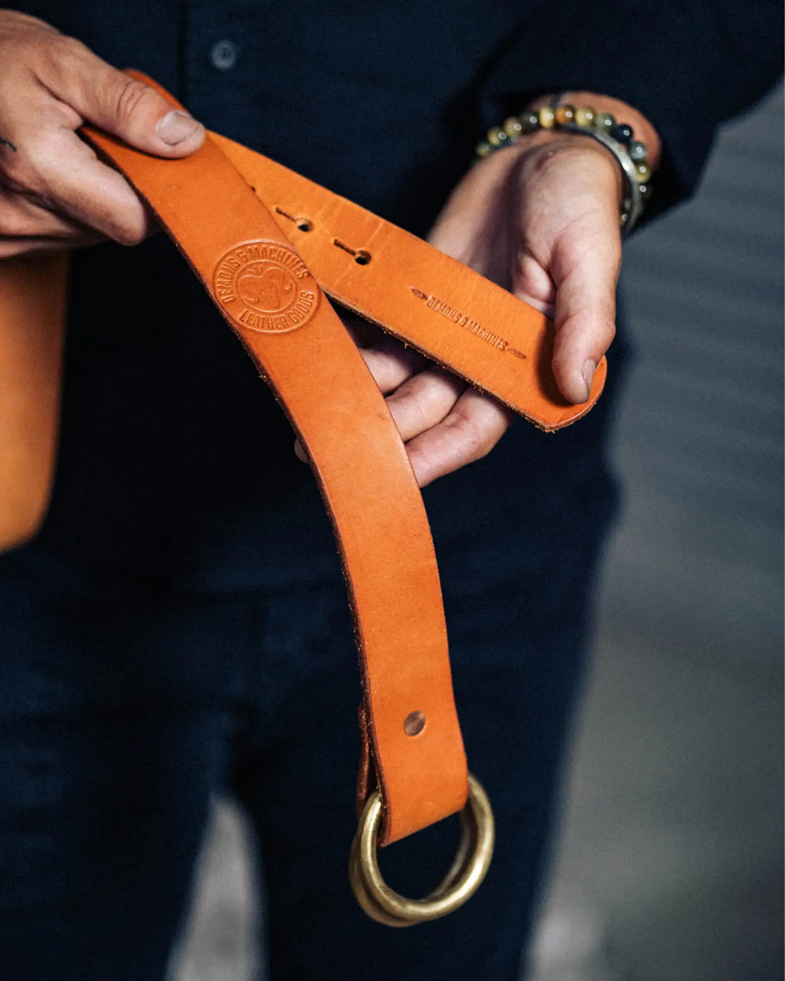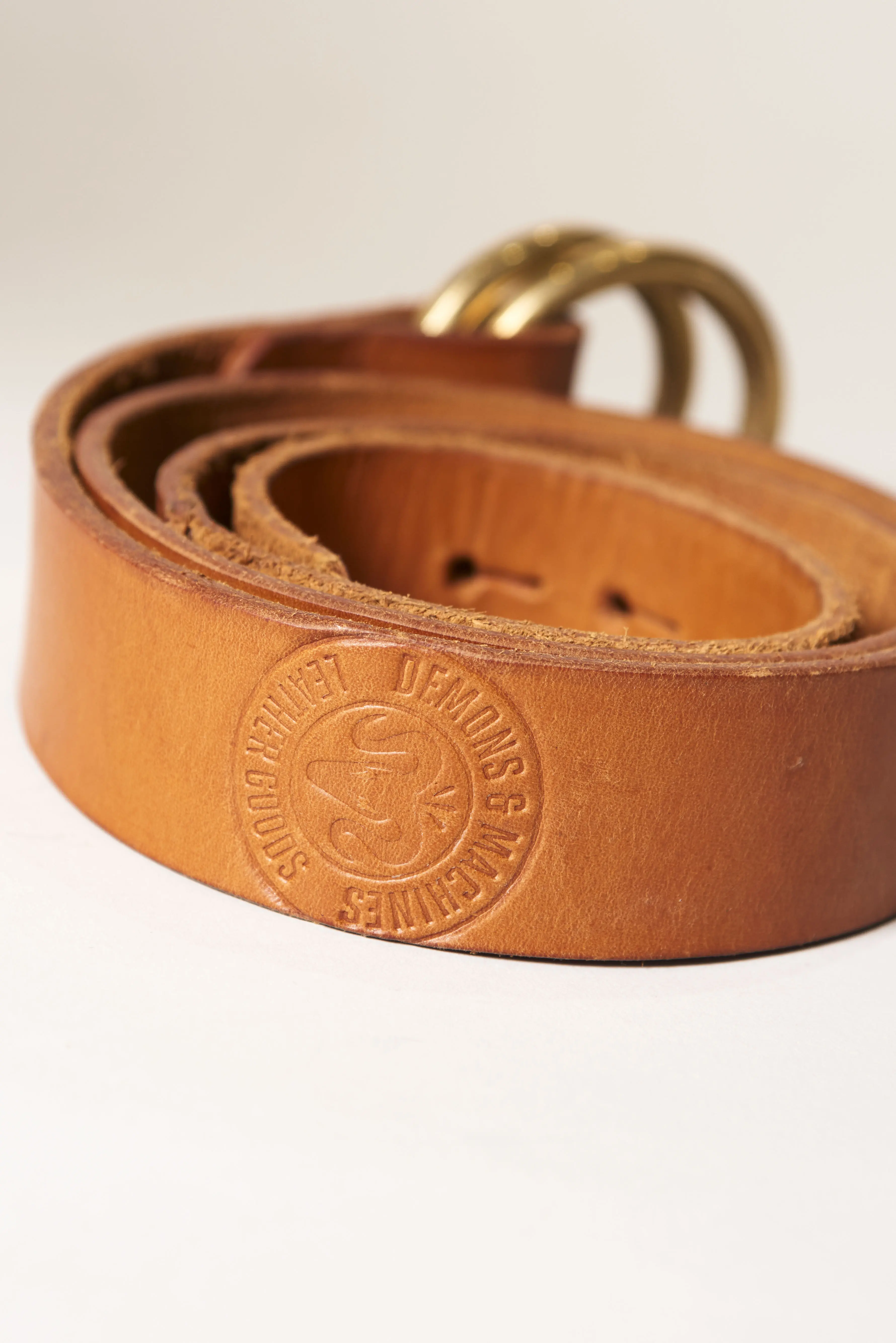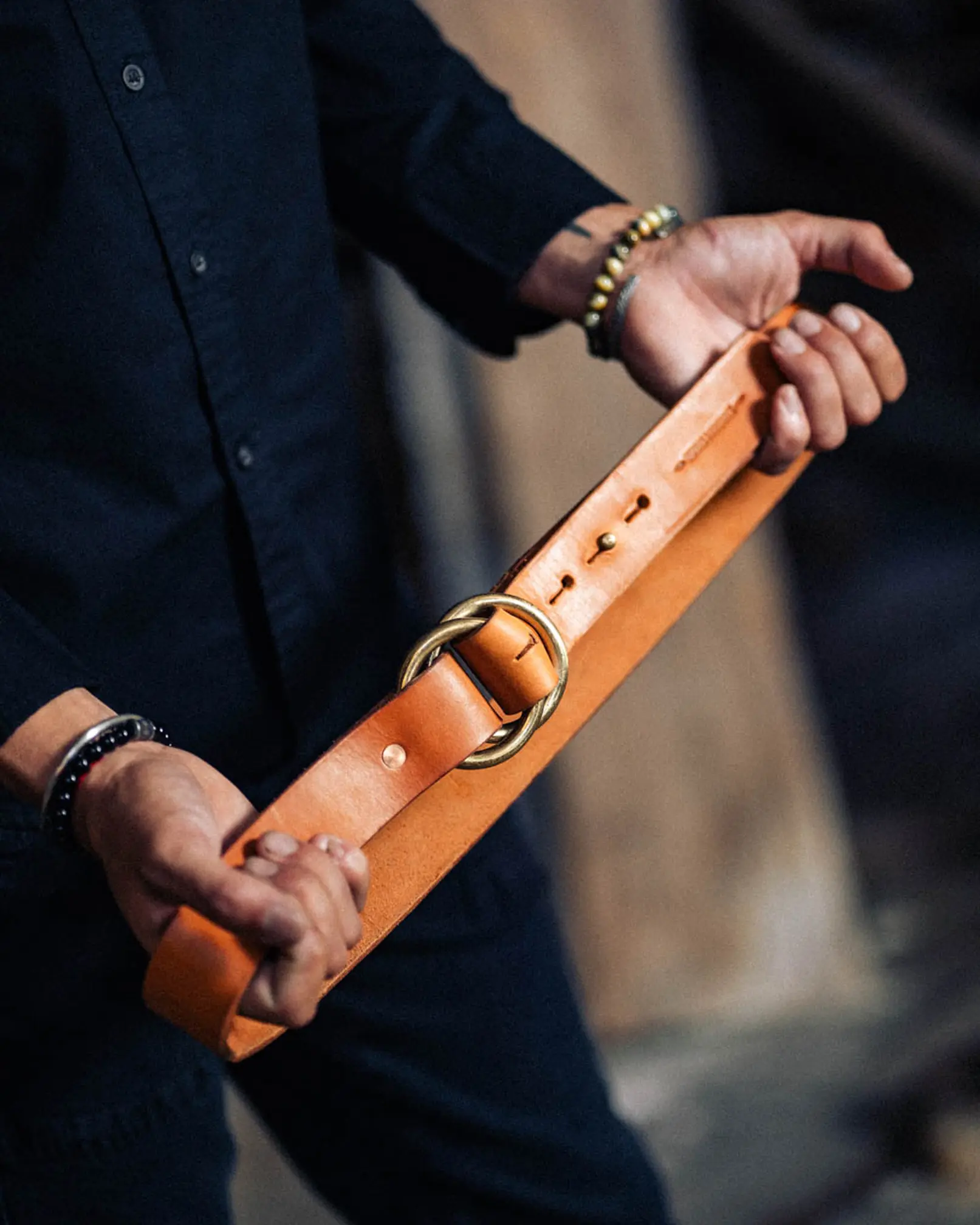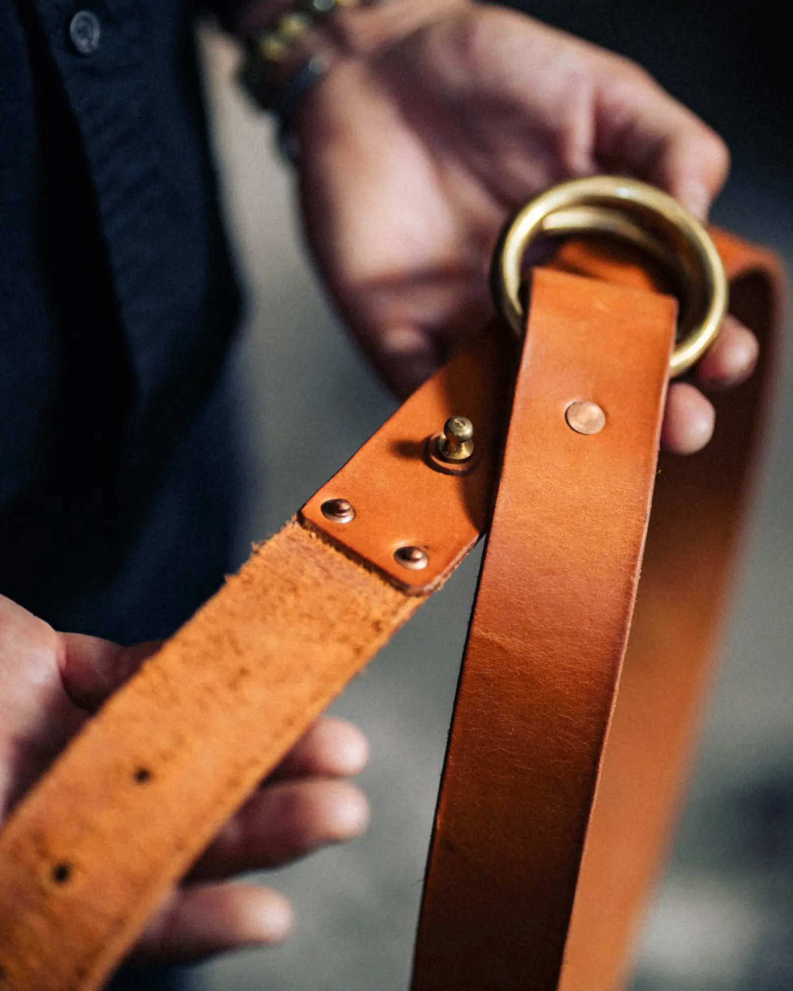Cinturón confeccionado artesanalmente de cuero. Hebilla fundida en bronce. Remaches de cobre.