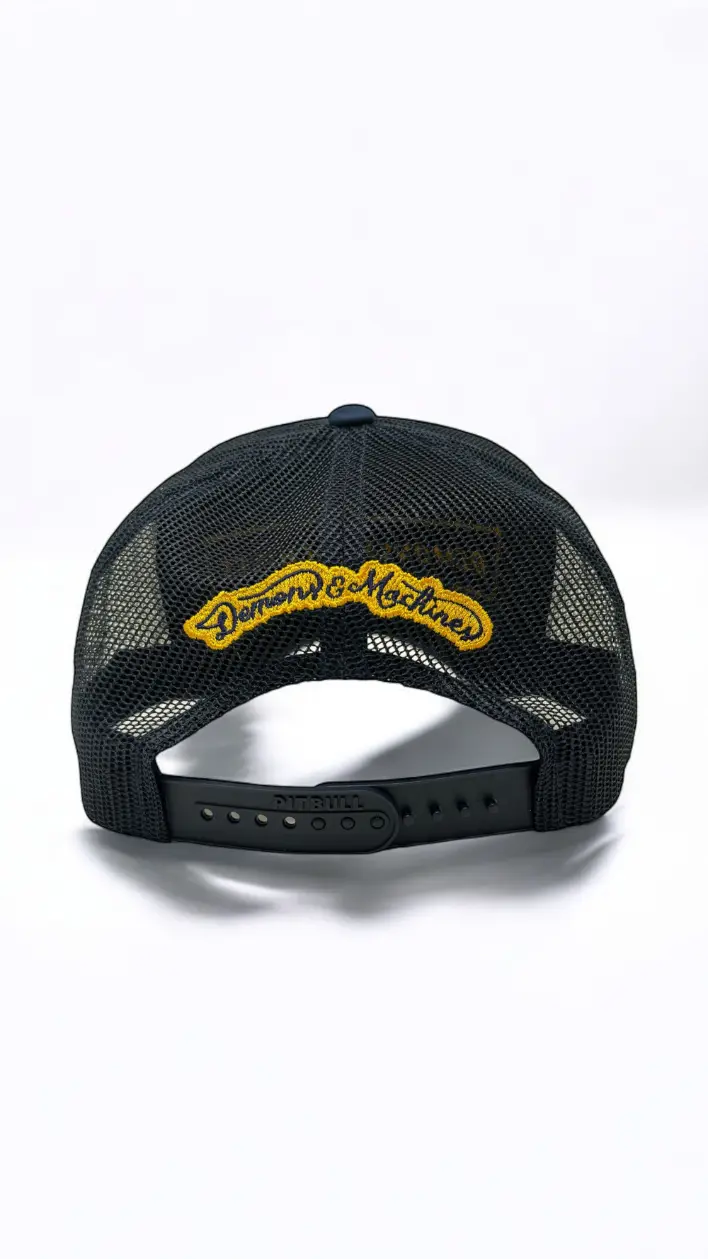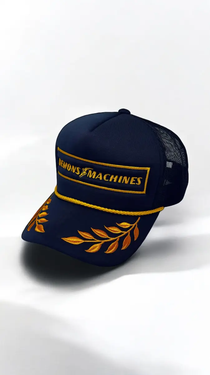 Gorra estilo trucker americano con laureles bordados en visera y bordado de marca al frente y en dorso. Malla de nylon en la parte trasera. Talle único, cierre ajustable.