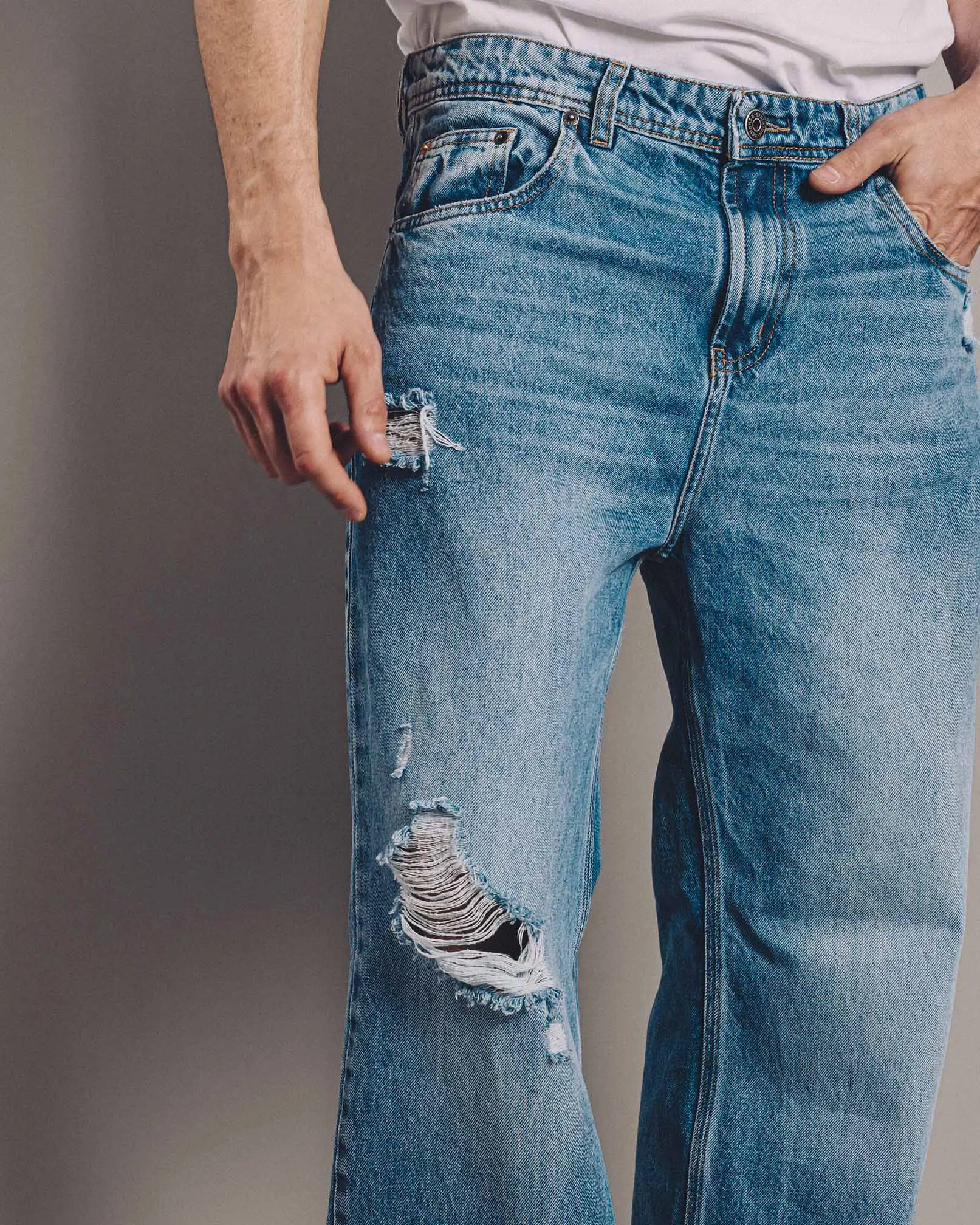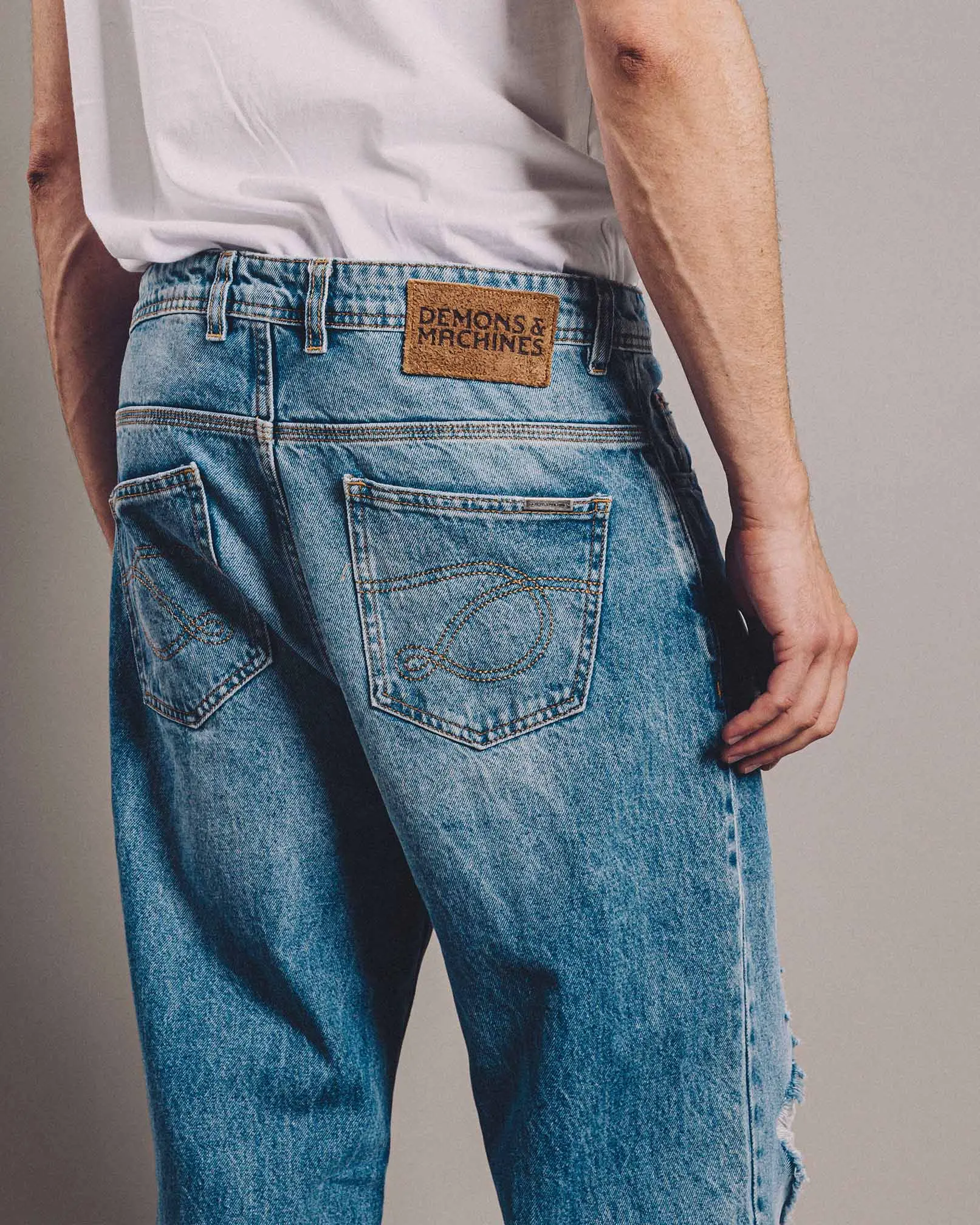 DENZEL es nuestro jean de calce relaxed confeccionado en denim rígido. Este fit se caracteriza por su corte relajado, de tiro medio-bajo cae con gran amplitud desde la parte trasera hacia las piernas, terminando en una botamanga bien ancha, logrando comodidad y libertad de movimiento. Lavado destroyed en tono celeste con reservas de color azul original y roturas localizadas a lo largo del frente.