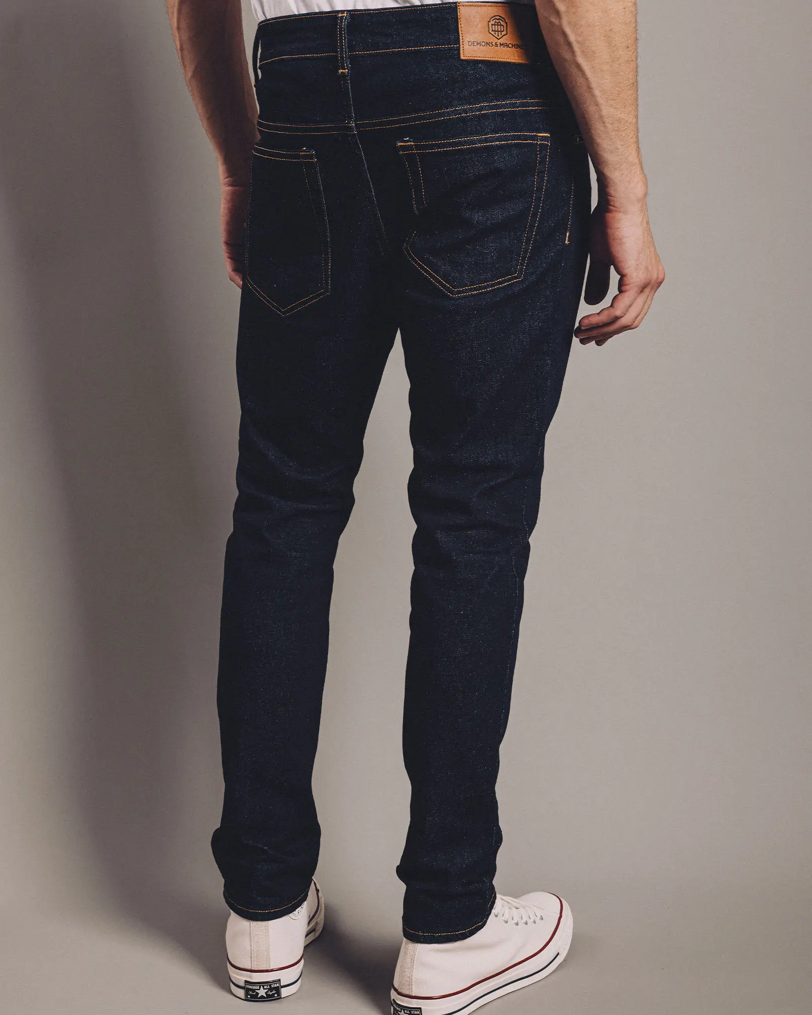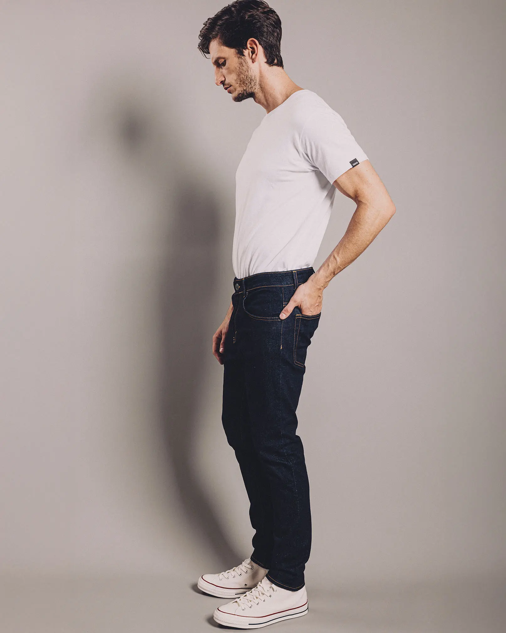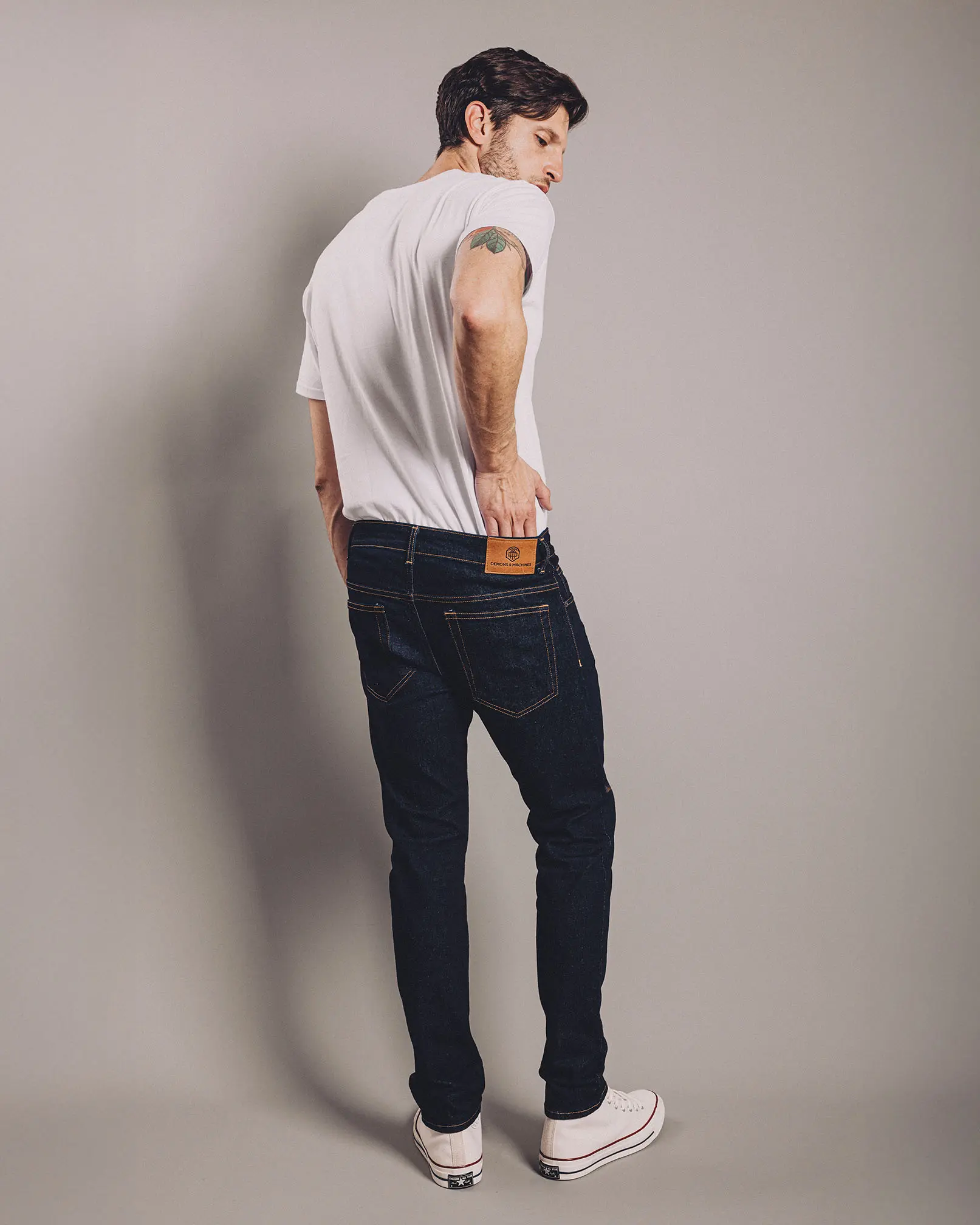 NEW JERSEY es nuestro jean de calce skinny confeccionado en denim elastizado importado de Turquía. Este fit es de tiro medio y queda entallado en piernas, acompañando el cuerpo sin pegarse excesivamente. La tela base, tejida en Turquía, es un gran diferencial en este modelo aportando comodidad, alta elasticidad y un tacto único. Su lavado raw original blue tiene una apariencia y tacto bien natural resaltando y jerarquizando la calidad del tejido, manteniendo el tono oscuro de manera uniforme.