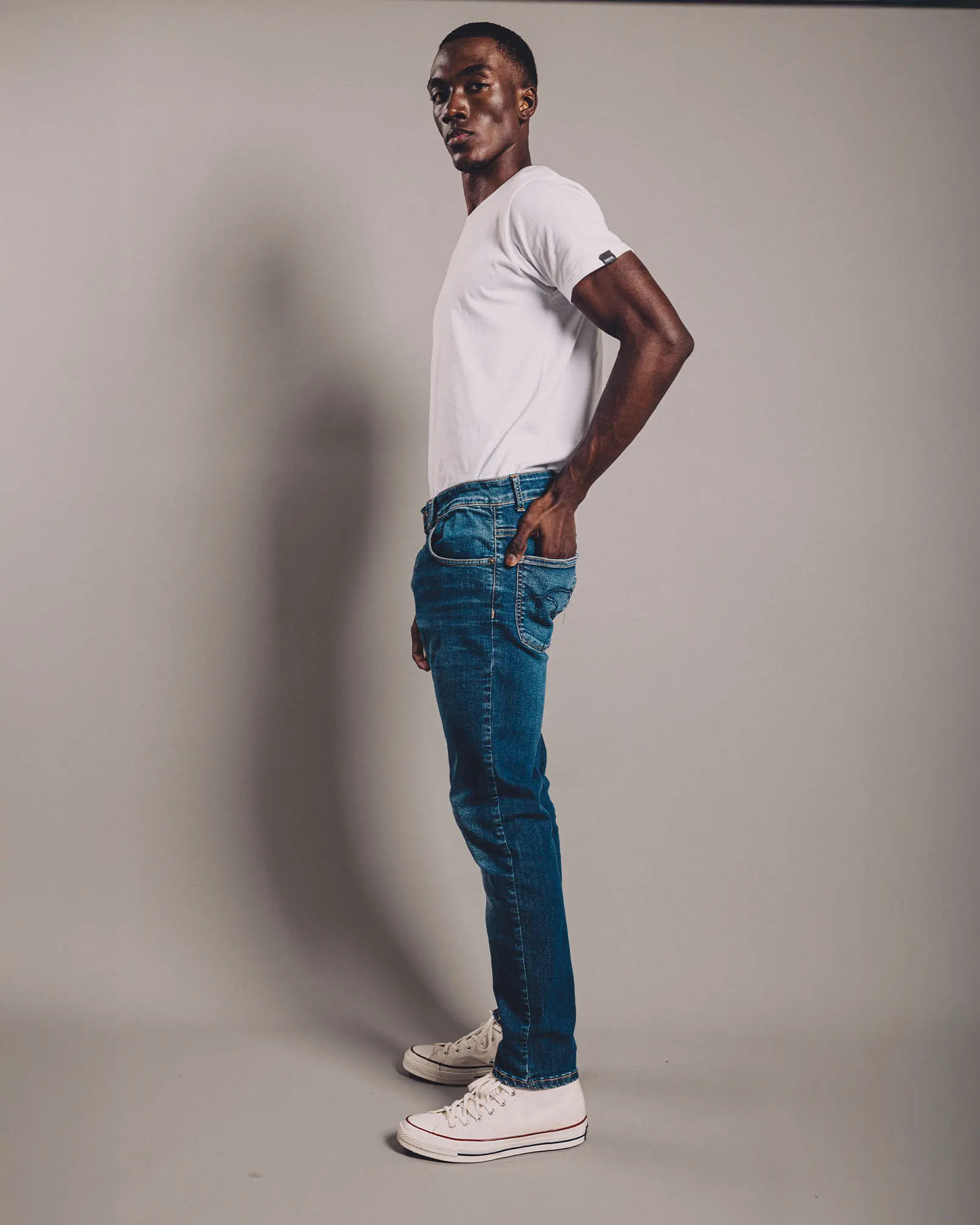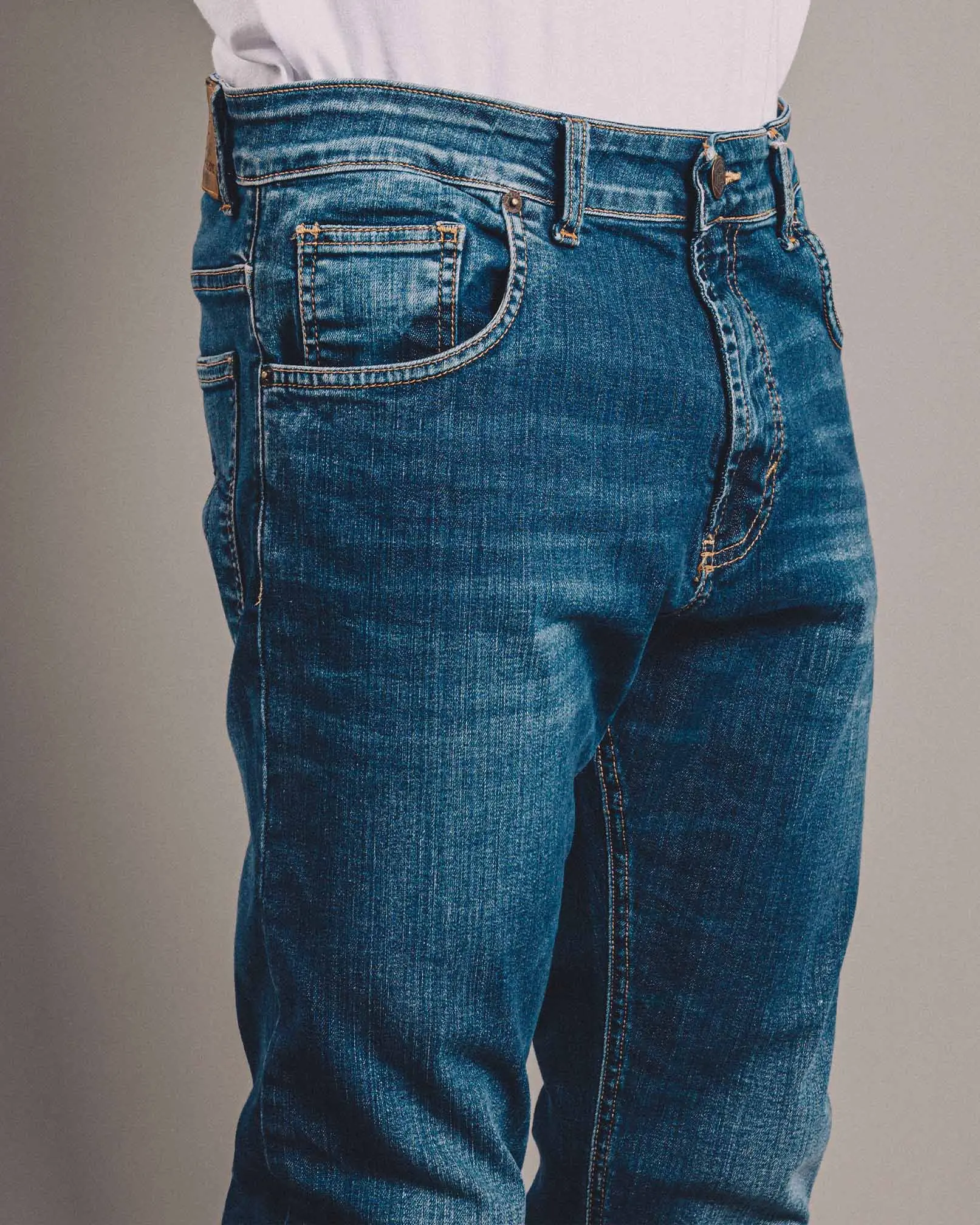 - Tiro Medio- Pierna entallada- Apertura de pierna entallada- Super Stretch Denim 10 Onzas (Origen Turquía) 98% Algodón 02% Elastano- Hilo de confección ocre- Alegoría azul en bolsillos traseros- Cremallera de metal- Botón & remaches plata italiana