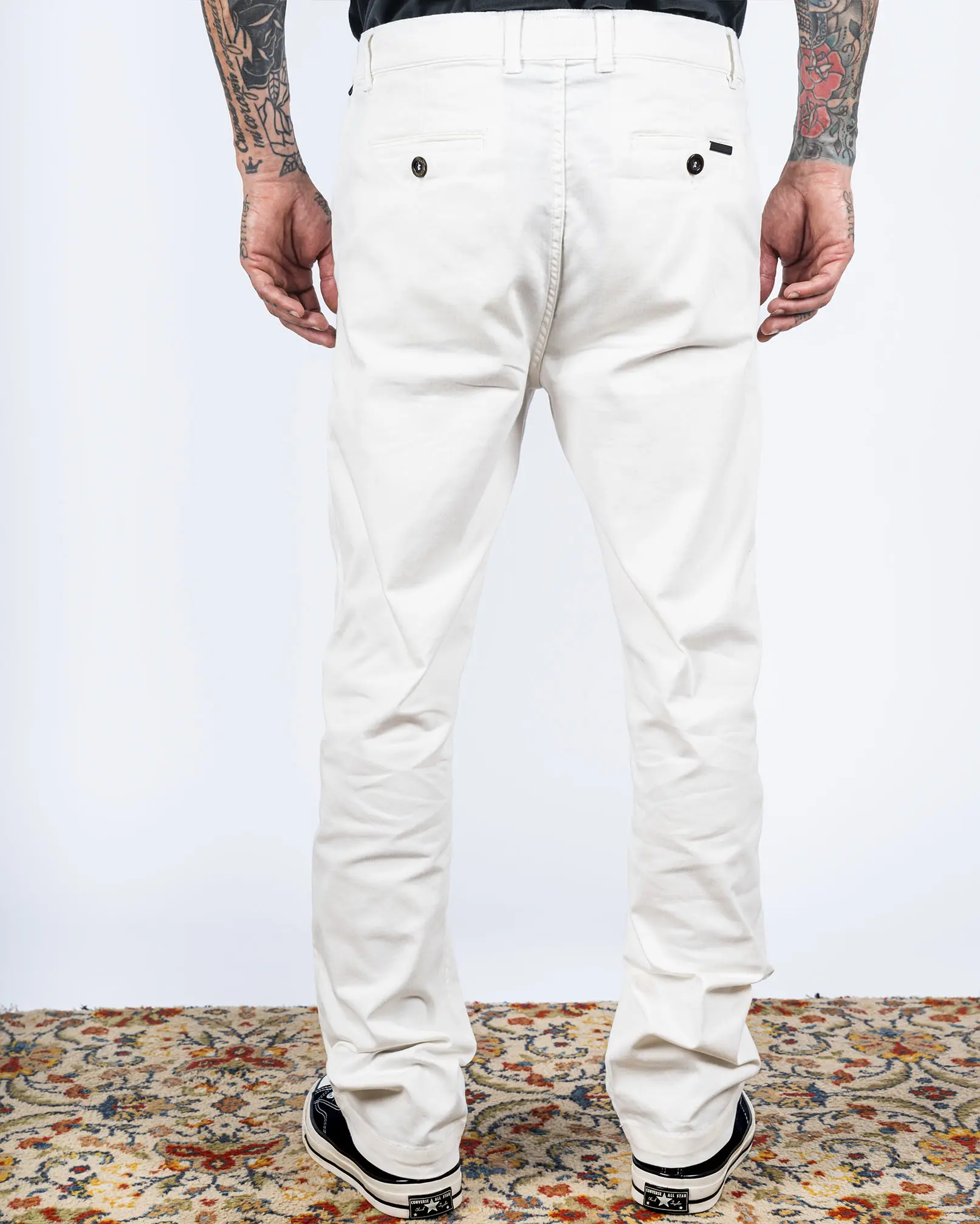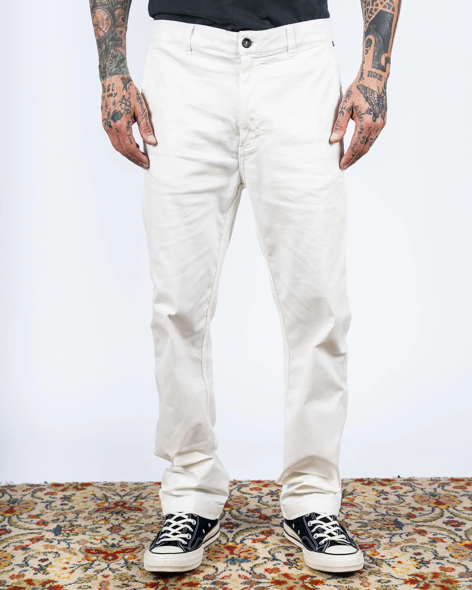 Pantalón confeccionado en gabardina de algodón con elastano. Botón con roturas al frente y cremallera de metal. Bolsillos laterales + bolsillo relojero del lado derecho. Bolsillos ojal en trasero con botón y ojal + pinzas de entalle. Calce relaxed y lavado suavizado.