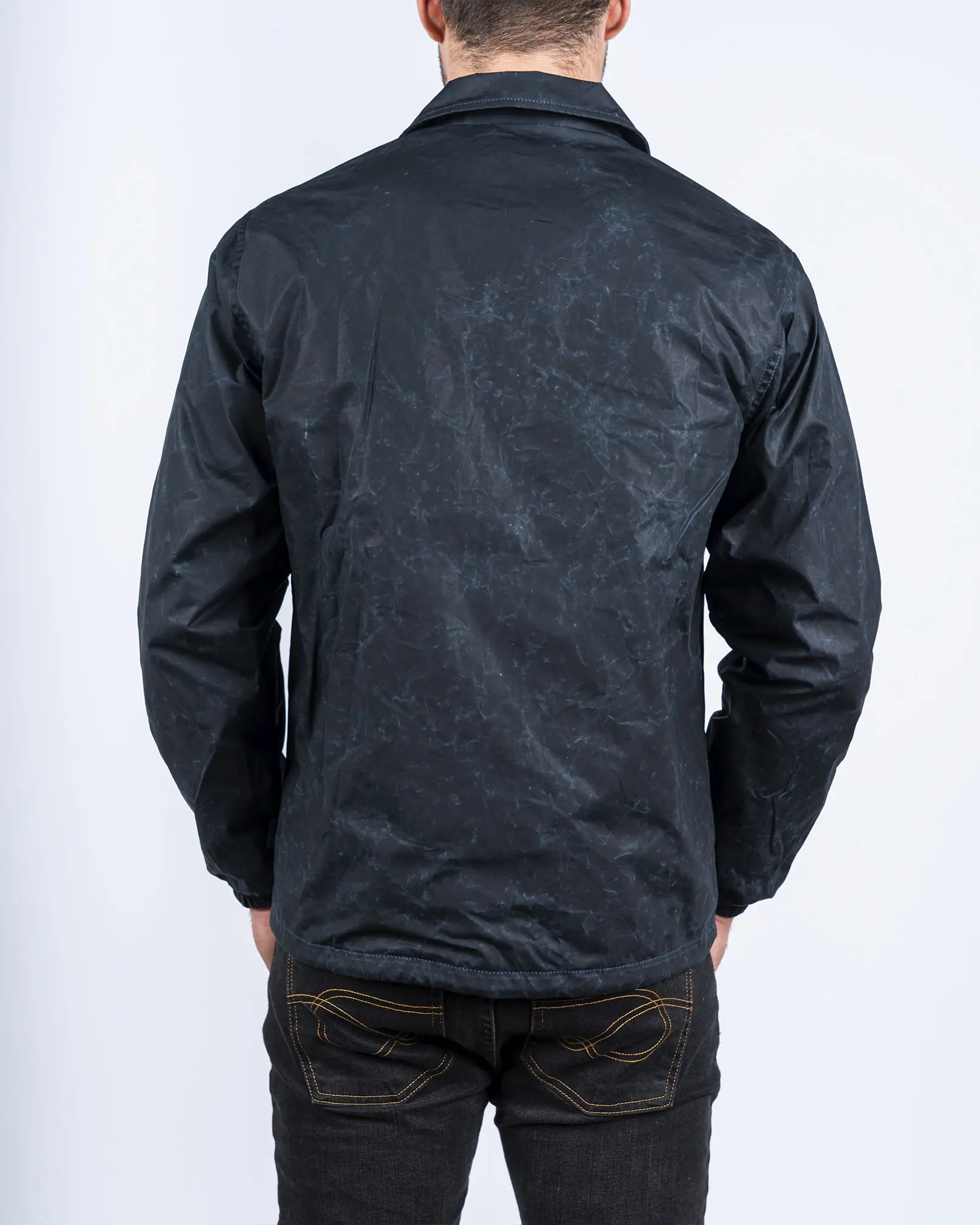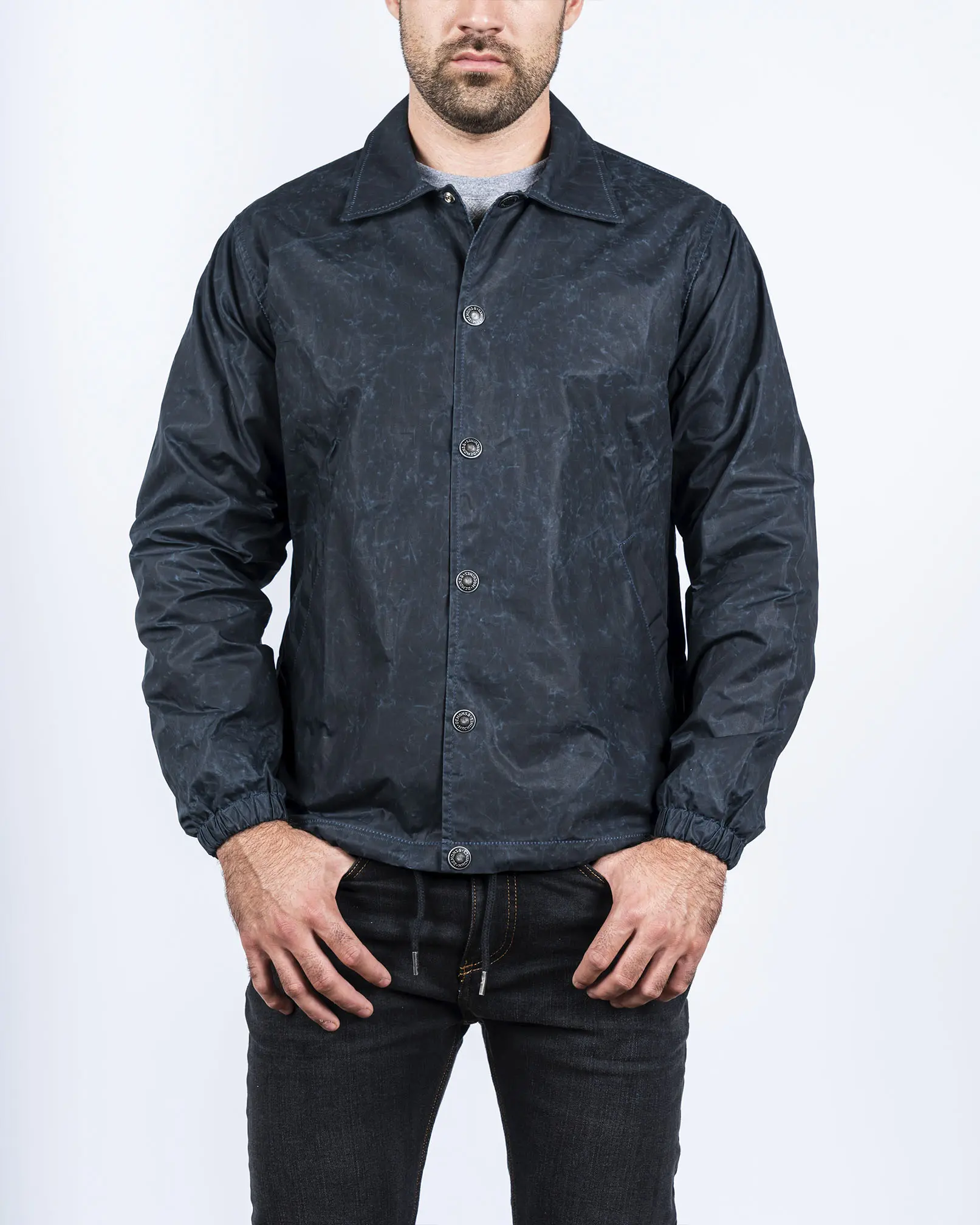 Campera estilo rompeviento confeccionada en tela de algodón encerado. De calce recto, con cuello camisero y broches suizos marcarios a la vista. Ojalillos respirables en sisas, bolsillos ojal inferiores. Interno forrado en sarga liviana que facilita el deslizamiento. Puños con elástico interno, bajo ruedo con cordón para ajustar. La tela principal tiene un proceso de encerado en rollo que impermeabiliza la tela logrando una gran repelencia al agua y dejando marcas propias y distintivas con el uso.