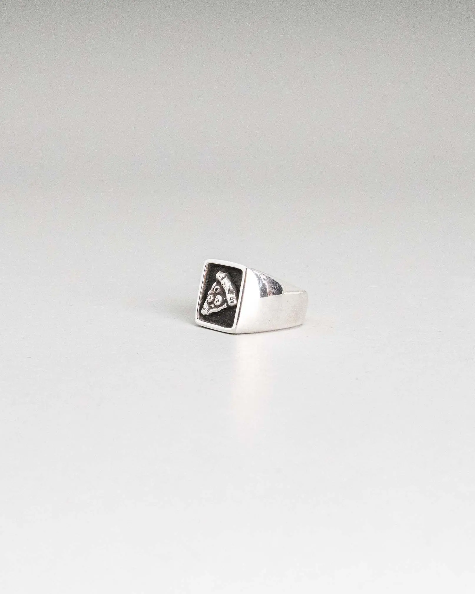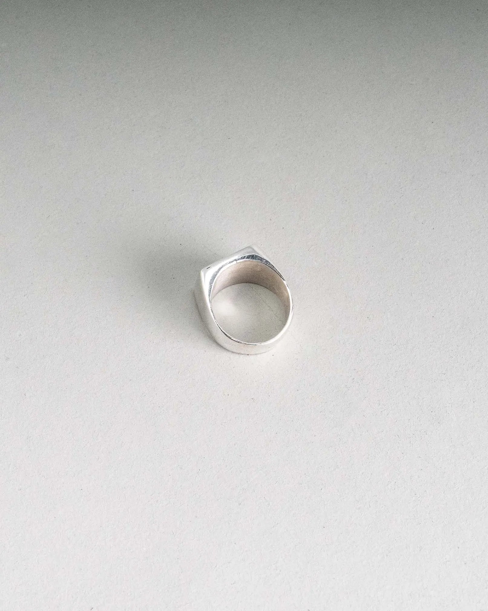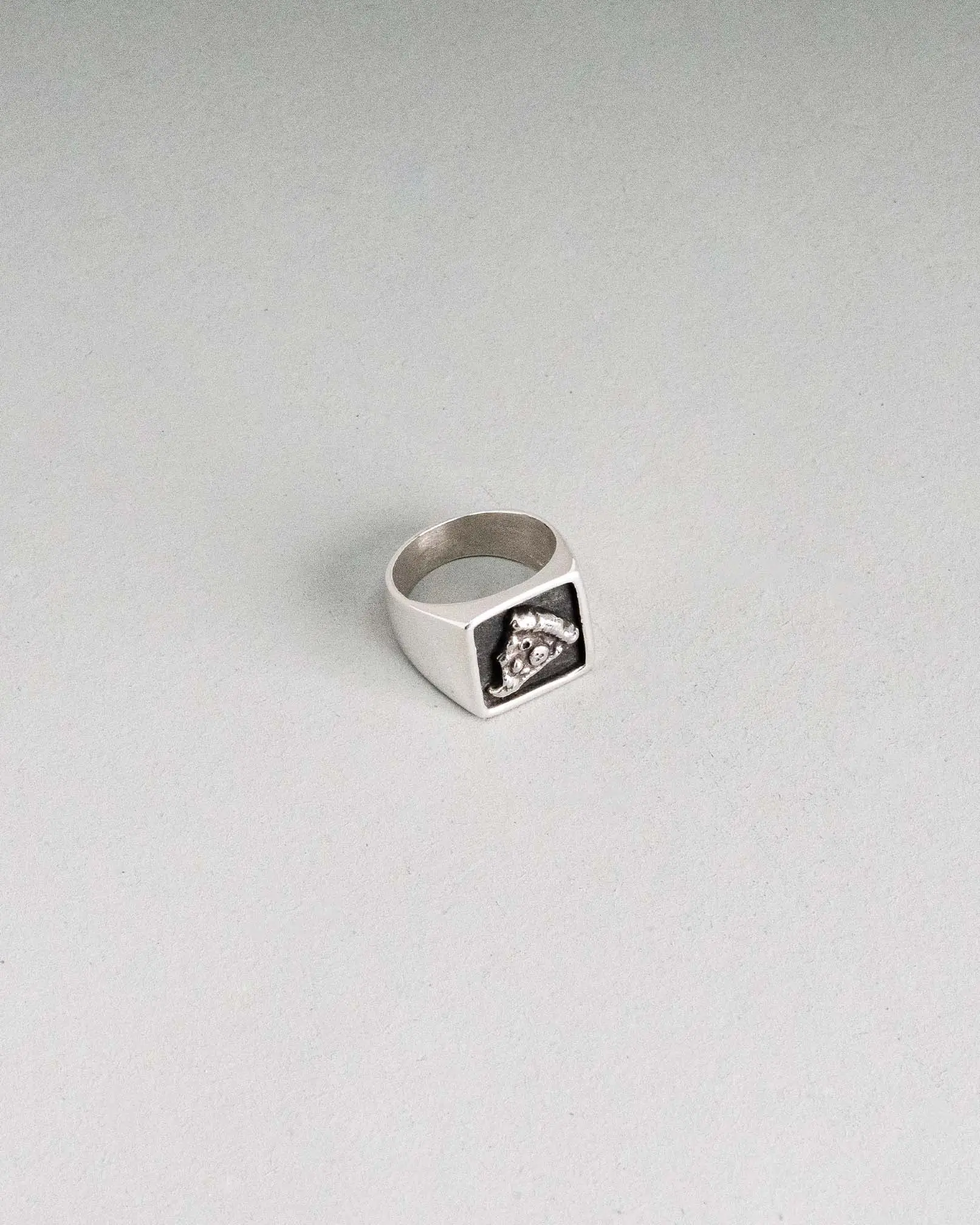 Anillo tallado a mano en cera, fundido en plata 925. Figura en bajo relieve, soldada y cincelada. Proceso de pavonado y pulido.