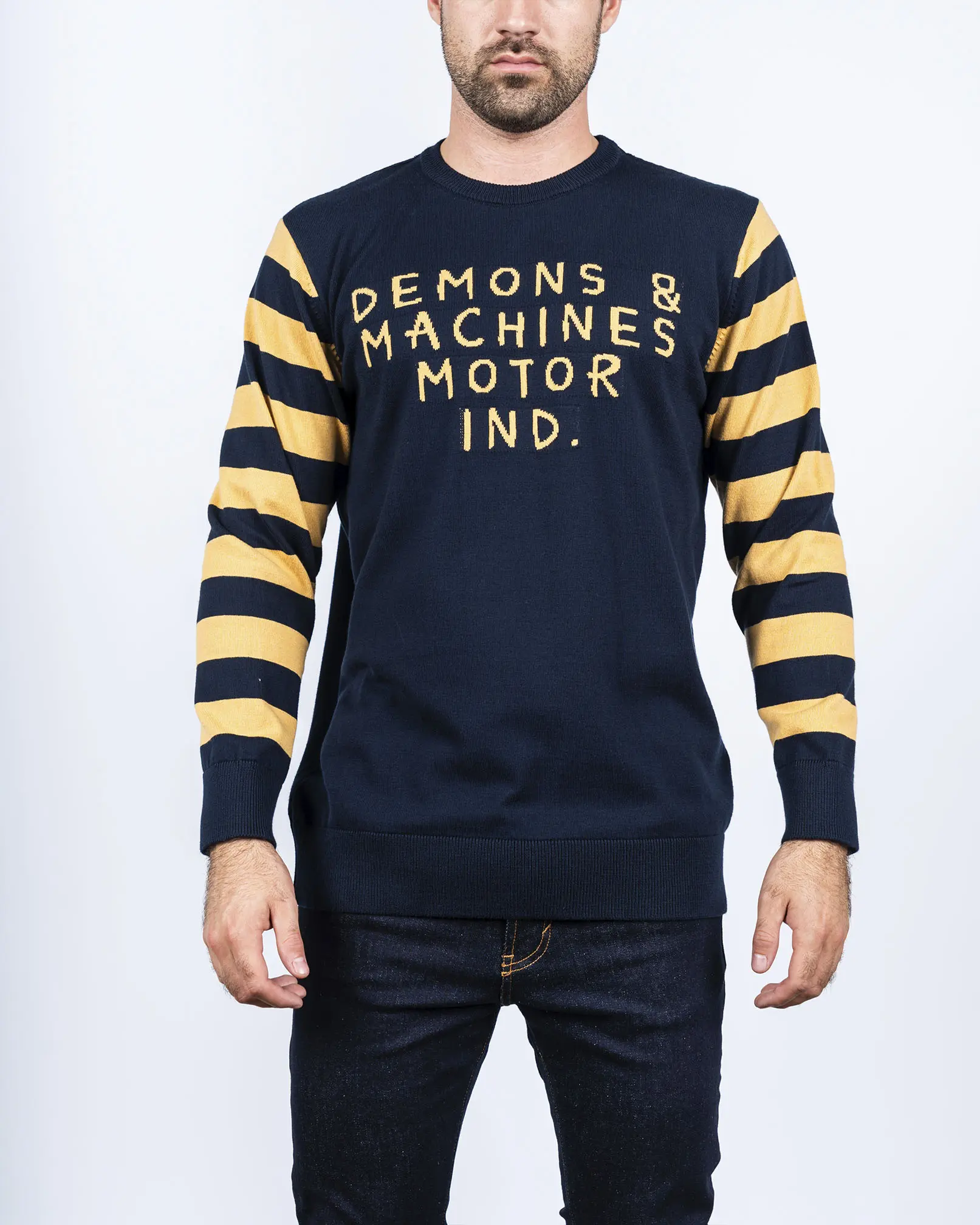 Sweater cuello redondo tejido en hilado de algodón. Arte frontal en jacqard y mangas rayadas.