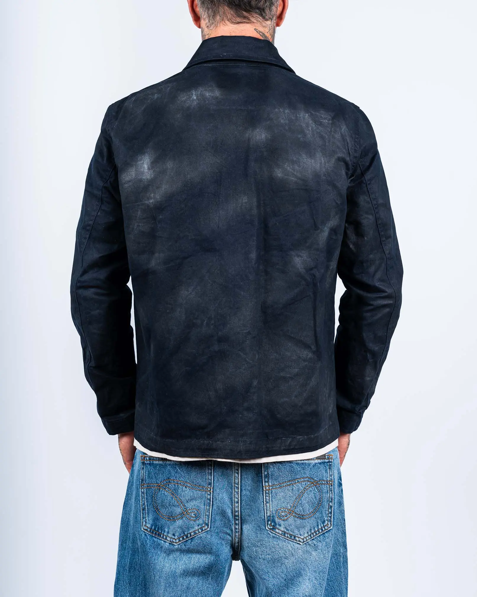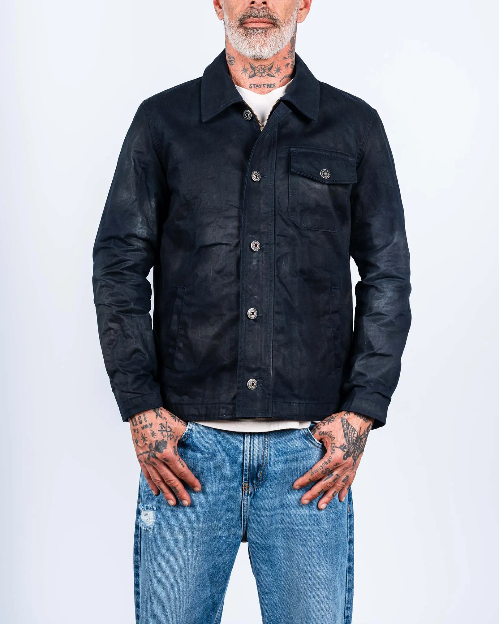 Campera confeccionada en gabardina 7 onzas con proceso wax (encerado) sobre prenda terminada. Cierre y botones de metal, bolsillos inferiores tipo ojal y bolsillo plaqué superior con broche snap. Forrería en gabardina 6 Oz a contramano y bolsillo ojal interno.
